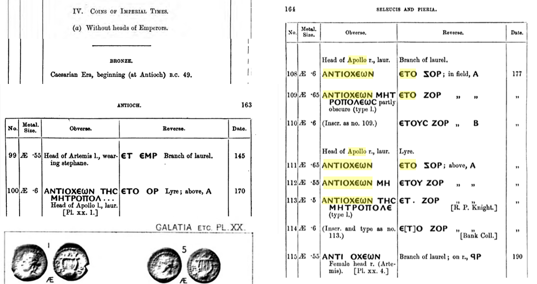- Wroth, Warwick. A Catalogue of the Greek Coins in the British Museum: Galatia, Cappadocia and Syria. London: British Museum, 1899. (aussi disponible en PDF sur FAC)