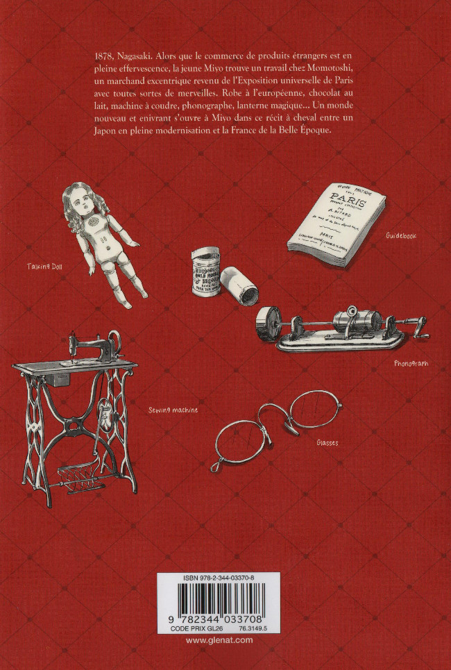 “Quand le Japon découvre la France. 1878, la France fait rayonner sa puissance industrielle et culturelle en organisant des expositions universelles, tandis que le Japon s’ouvre au monde après 200 années d’isolationnisme. À Nagasaki, Miyo, orpheline qui a pour seul talent le don de clairvoyance au travers des objets qu’elle touche, parvient à trouver un emploi chez Vingt, commercialisant des objets importés d’Europe. Au contact de l’Occident, elle découvrira un monde nouveau qui la conduira jusqu’à Paris…