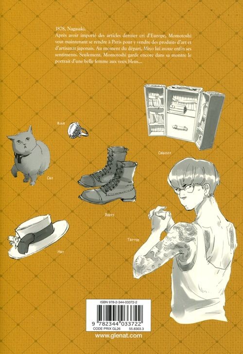 “1878, Nagasaki. Après avoir importé des articles dernier cri d’Europe, Momotoshi veut maintenant se rendre à Paris pour y vendre des produits d’art et d’artisanat japonais. Au moment du départ, Miyo lui avoue enfin ses sentiments. Seulement, Momotoshi garde encore dans sa montre le portrait d’une belle femme aux yeux bleus…”