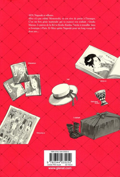 “1879, Nagasaki et ailleurs. Miyo n’a pas oublié Momotoshi, ni son rêve de partir à l’étranger. C’est un bon génie inattendu qui va exaucer son souhait : Gisuke Matsuo, le patron de la Kiryu Kosho Kaisha, l’invite à travailler dans sa boutique à Paris. Et Miyo quitte Nagasaki pour un long voyage de deux ans…”
