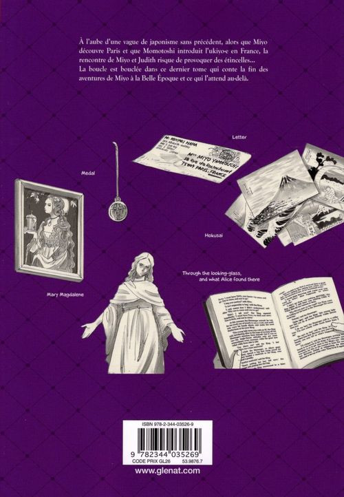 “À l’aube d’une vague de japonisme sans précédent, alors que Miyo découvre Paris et que Momotoshi fait découvrir l’ukiyo-e aux Français, la rencontre de Miyo et Judith risque de provoquer des étincelles… La boucle est bouclée dans ce dernier tome qui conte la fin des aventures de Miyo à la Belle Époque et ce qui l’attend au-delà.”