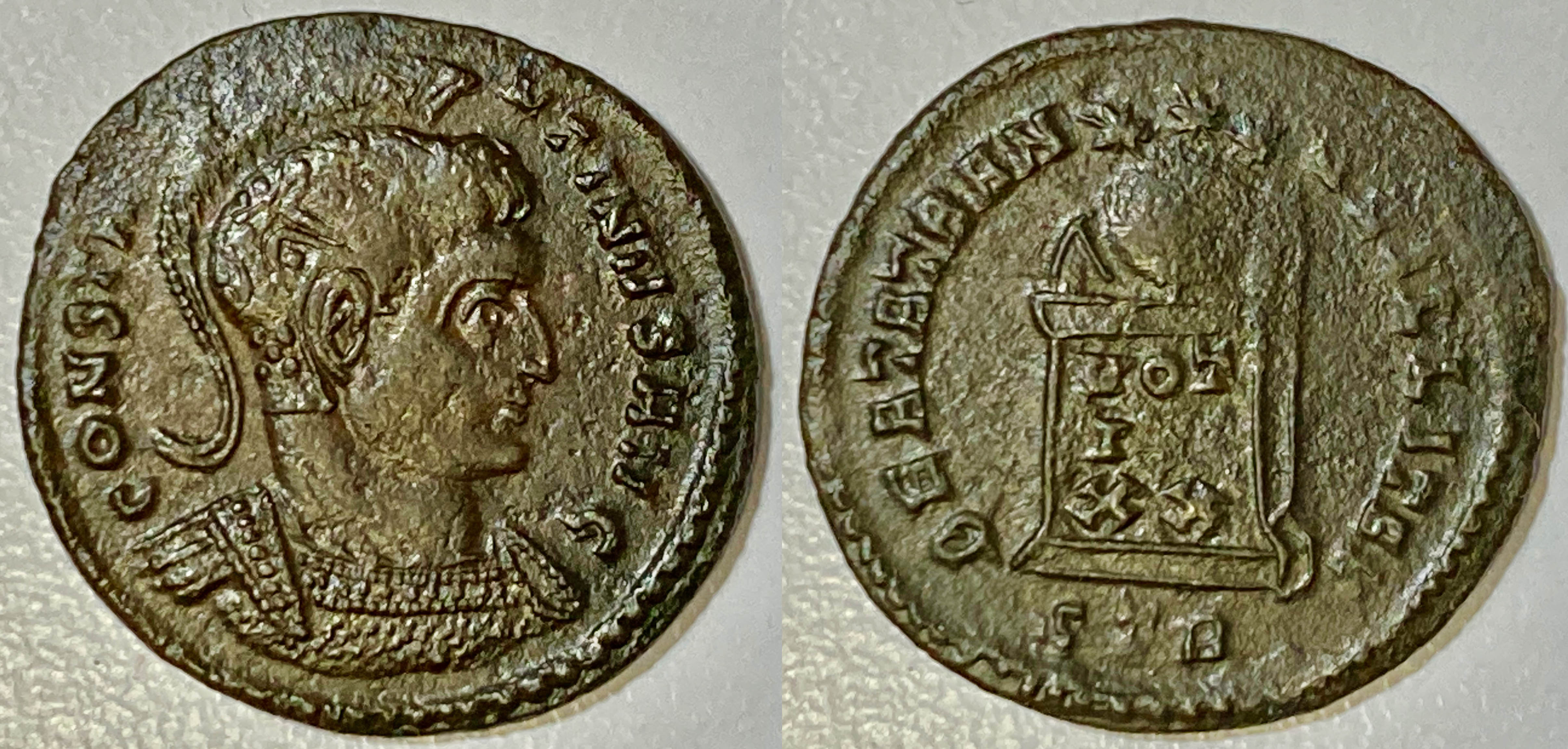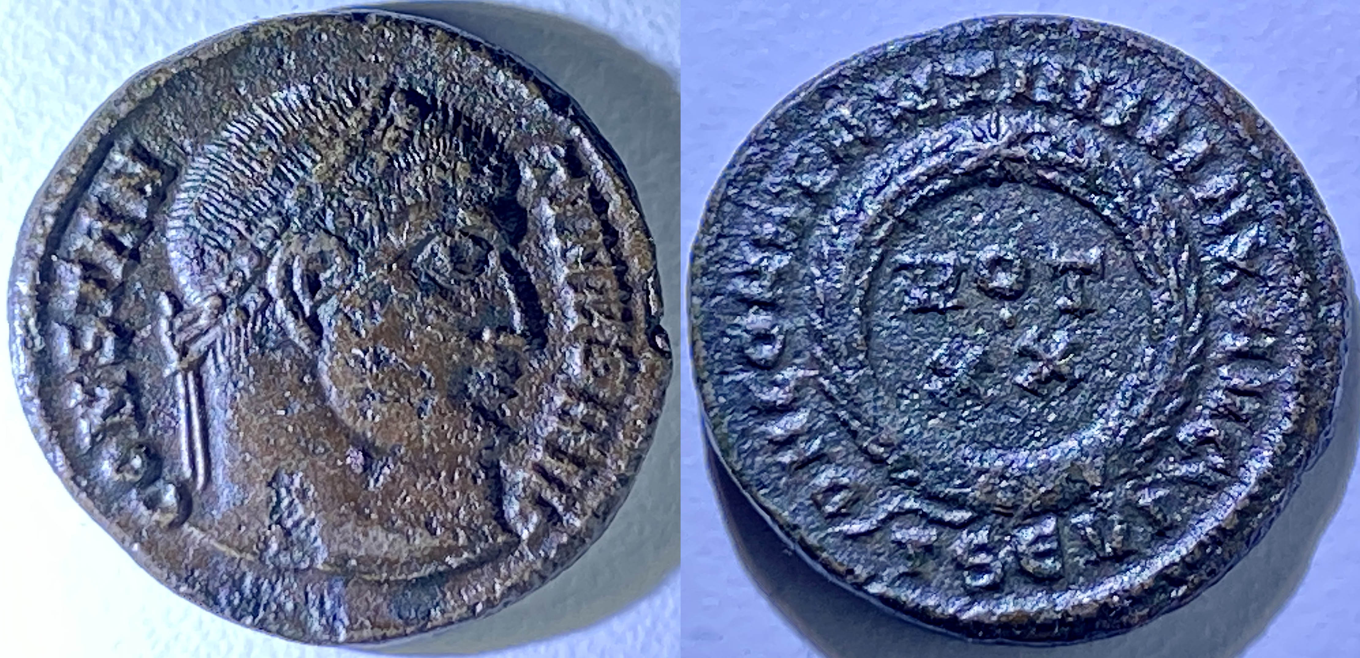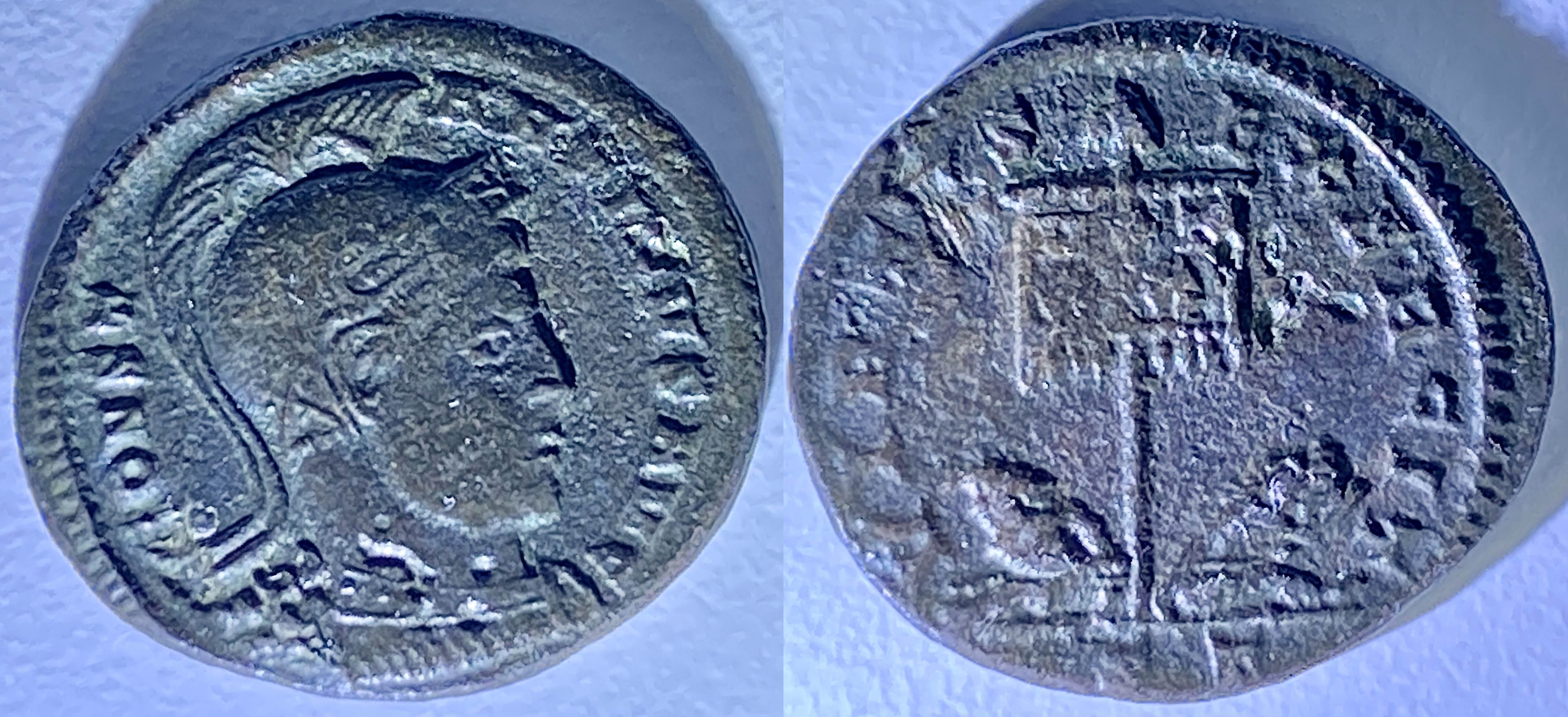 La seconde pièce est un beau follis réduit (AE3, VG [Very Good], AE [Bronze], 19 mm, 2.406 g, payé environ $5 ; die-axis: ↑↑). L’avers nous montre une buste de l’empereur diademmé (de forme carrée), cuirassé et drapé à droite, avec l’inscription CONSTANTI-NVS MAX[IMVS] AVG[VSTVS] (maximus est le superlatif de magnus (grand); “Constantinus le plus grand des Augustes”). Le revers illustre une place forte (constituée de sept niveaux et d’une grande ouverture [sur quatre niveaux et demi] qui n’a pas de porte) surmontée de deux tourelles entourants une étoile (❋), avec l’inscription latine PROVIDEN-TIAE AVGG[VSTORVM] (le double “G” équivaut à un duorum implicite; “[Dédié] à la prévoyance des deux empereurs“), et un SMKS en exergue (marque de la sixième officine [zeta] de l’atelier de Cyzique [Sacra Moneta Kyzici]).