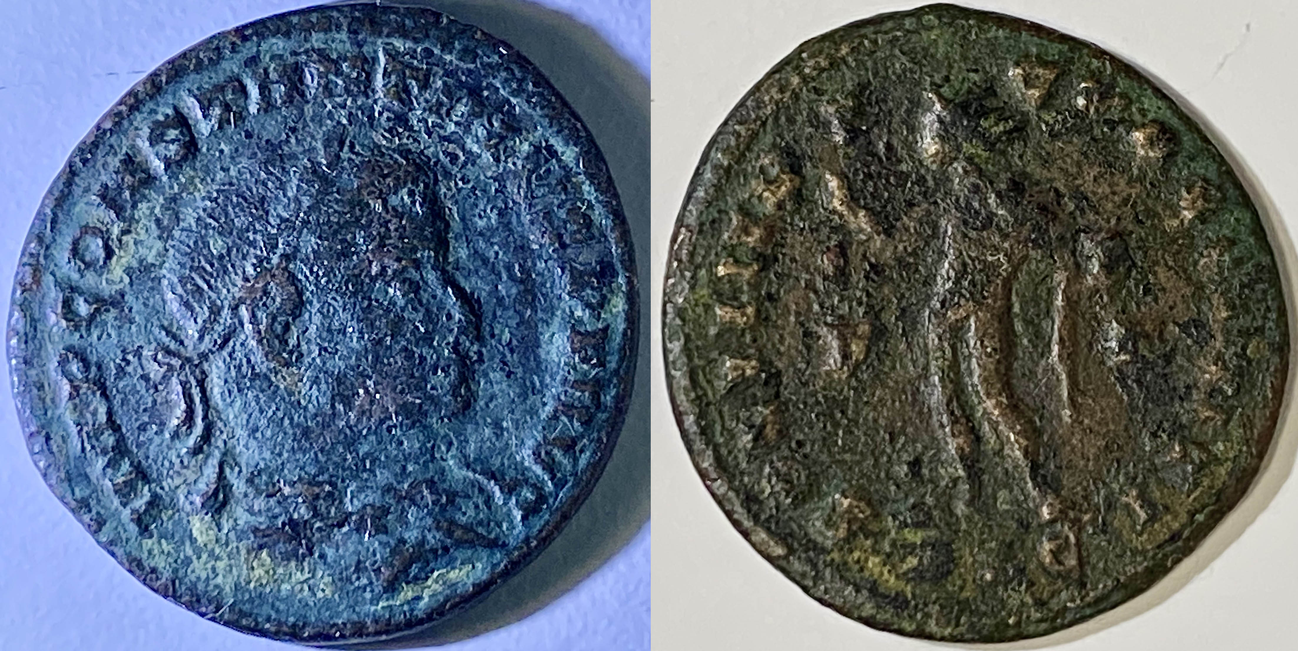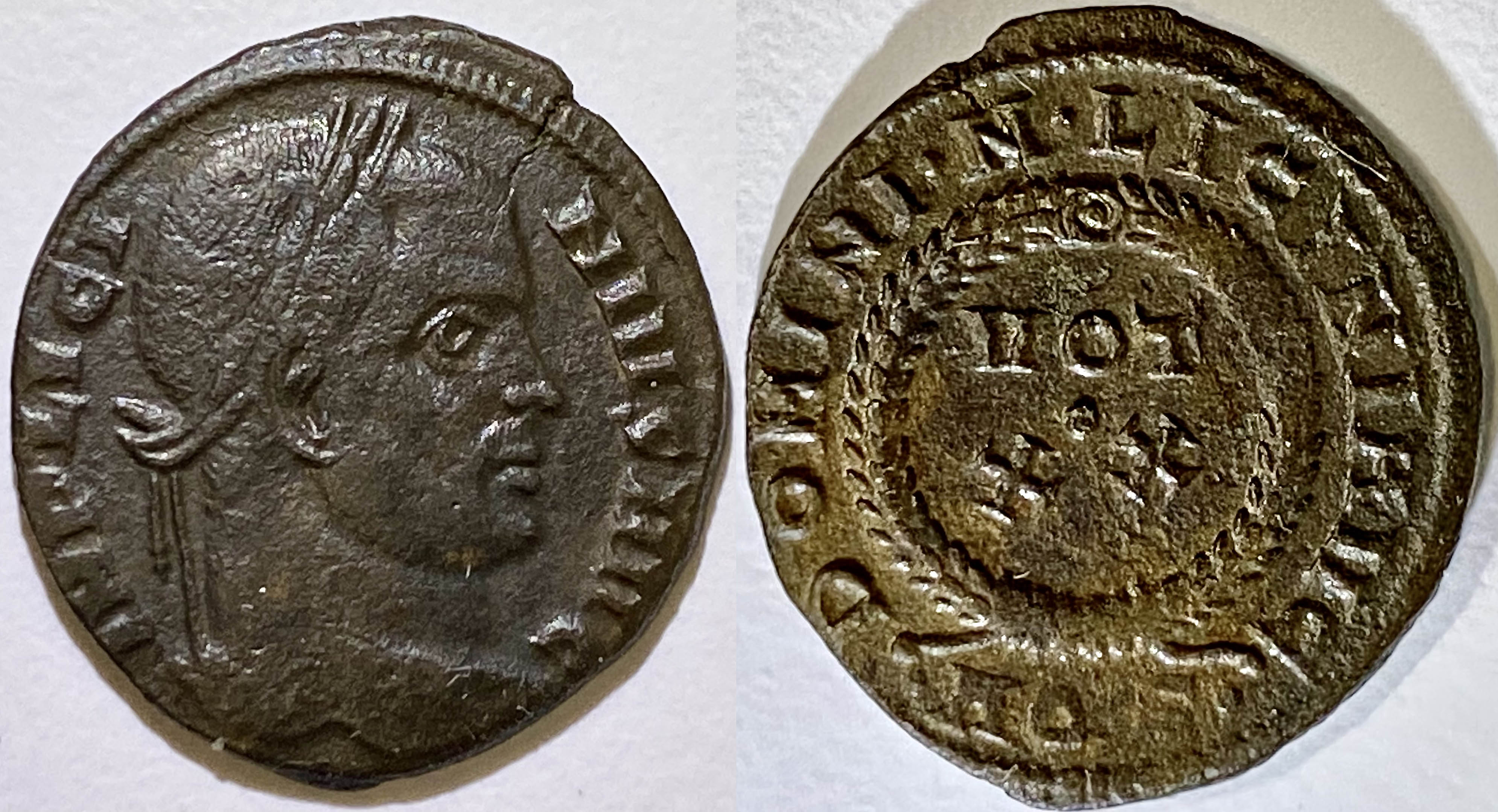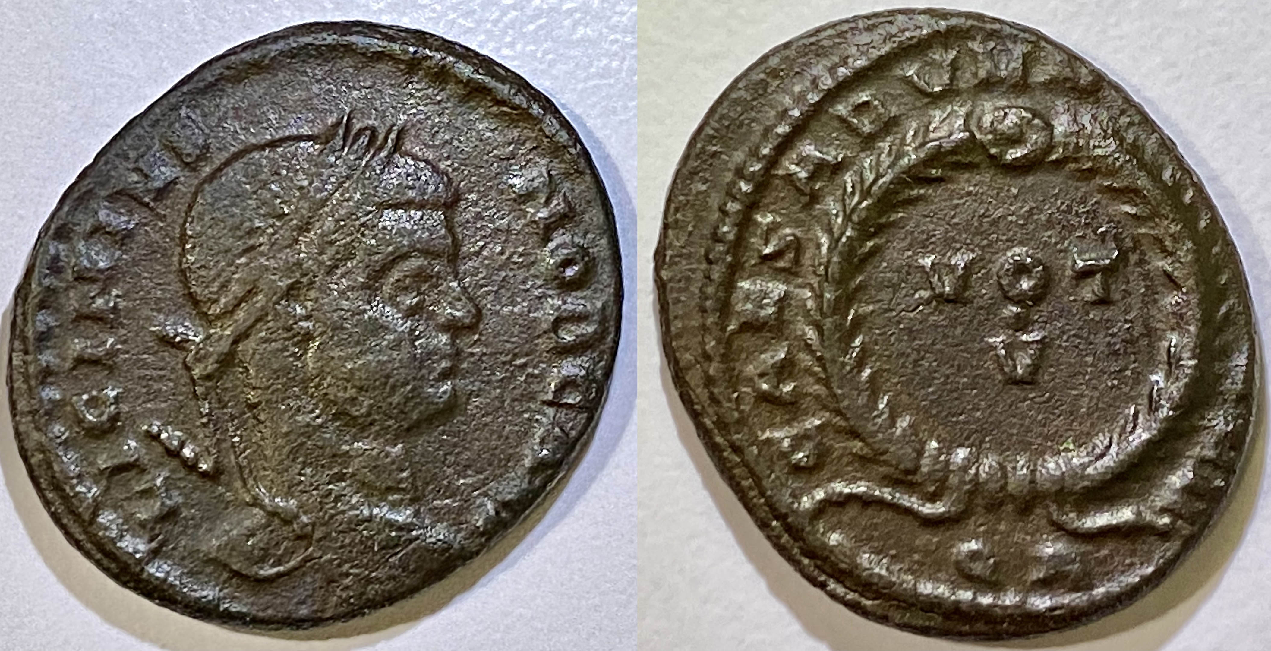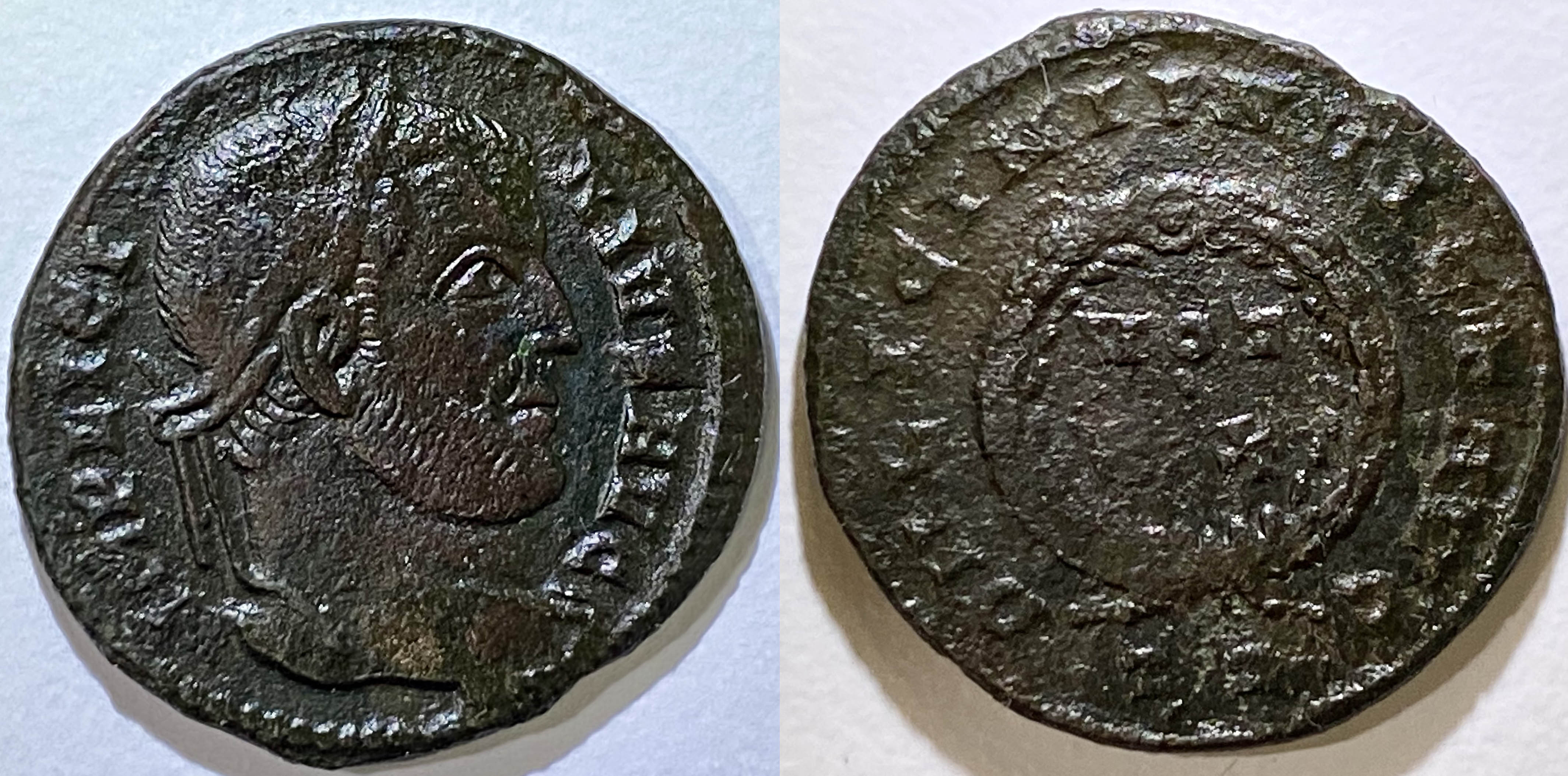 La seconde pièce est un beau follis réduit (AE3, VG [Very Good], AE [Bronze], 19 mm, 2.406 g, payé environ $5 ; die-axis: ↑↑). L’avers nous montre une buste de l’empereur diademmé (de forme carrée), cuirassé et drapé à droite, avec l’inscription CONSTANTI-NVS MAX[IMVS] AVG[VSTVS] (maximus est le superlatif de magnus (grand); “Constantinus le plus grand des Augustes”). Le revers illustre une place forte (constituée de sept niveaux et d’une grande ouverture [sur quatre niveaux et demi] qui n’a pas de porte) surmontée de deux tourelles entourants une étoile (❋), avec l’inscription latine PROVIDEN-TIAE AVGG[VSTORVM] (le double “G” équivaut à un duorum implicite; “[Dédié] à la prévoyance des deux empereurs“), et un SMKS en exergue (marque de la sixième officine [zeta] de l’atelier de Cyzique [Sacra Moneta Kyzici]).