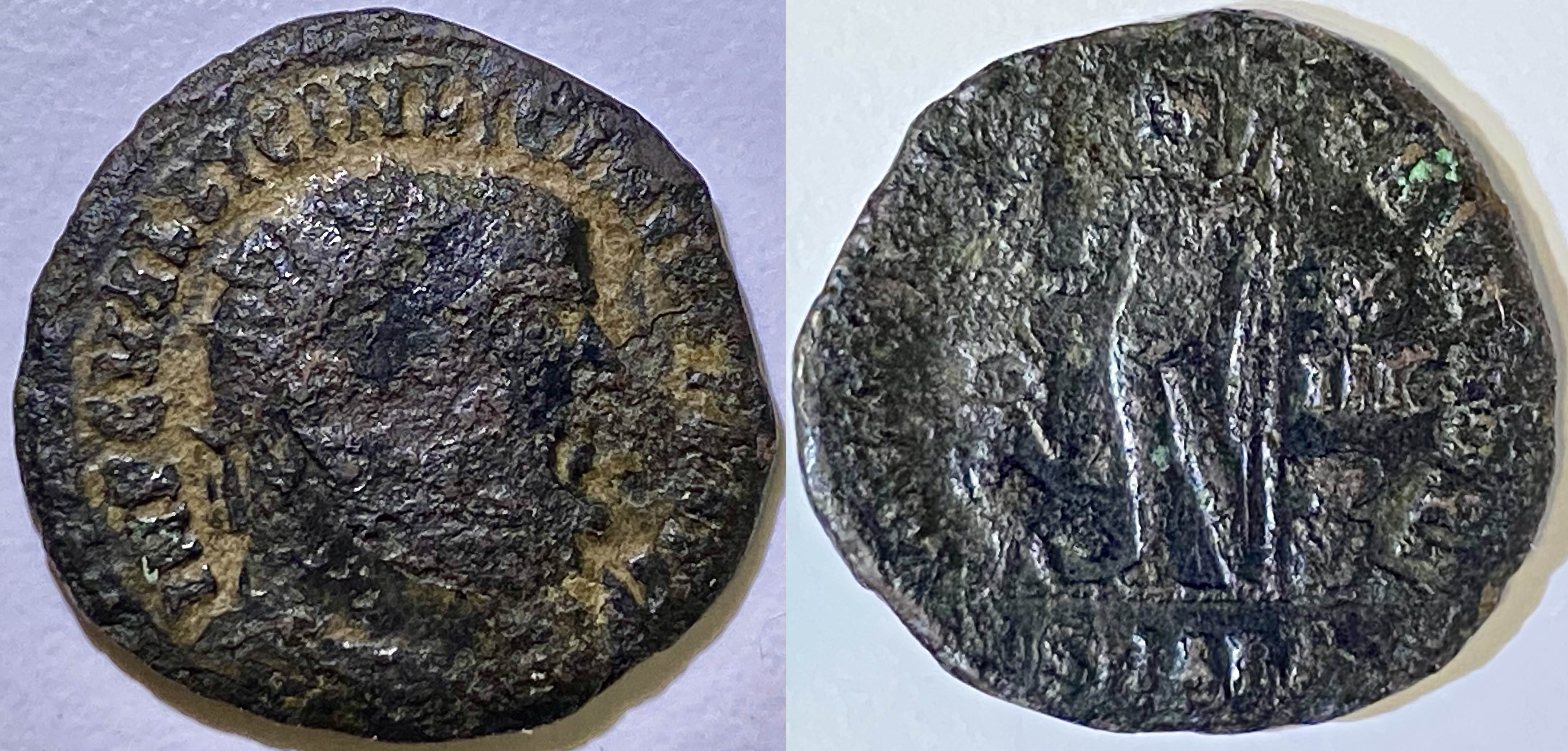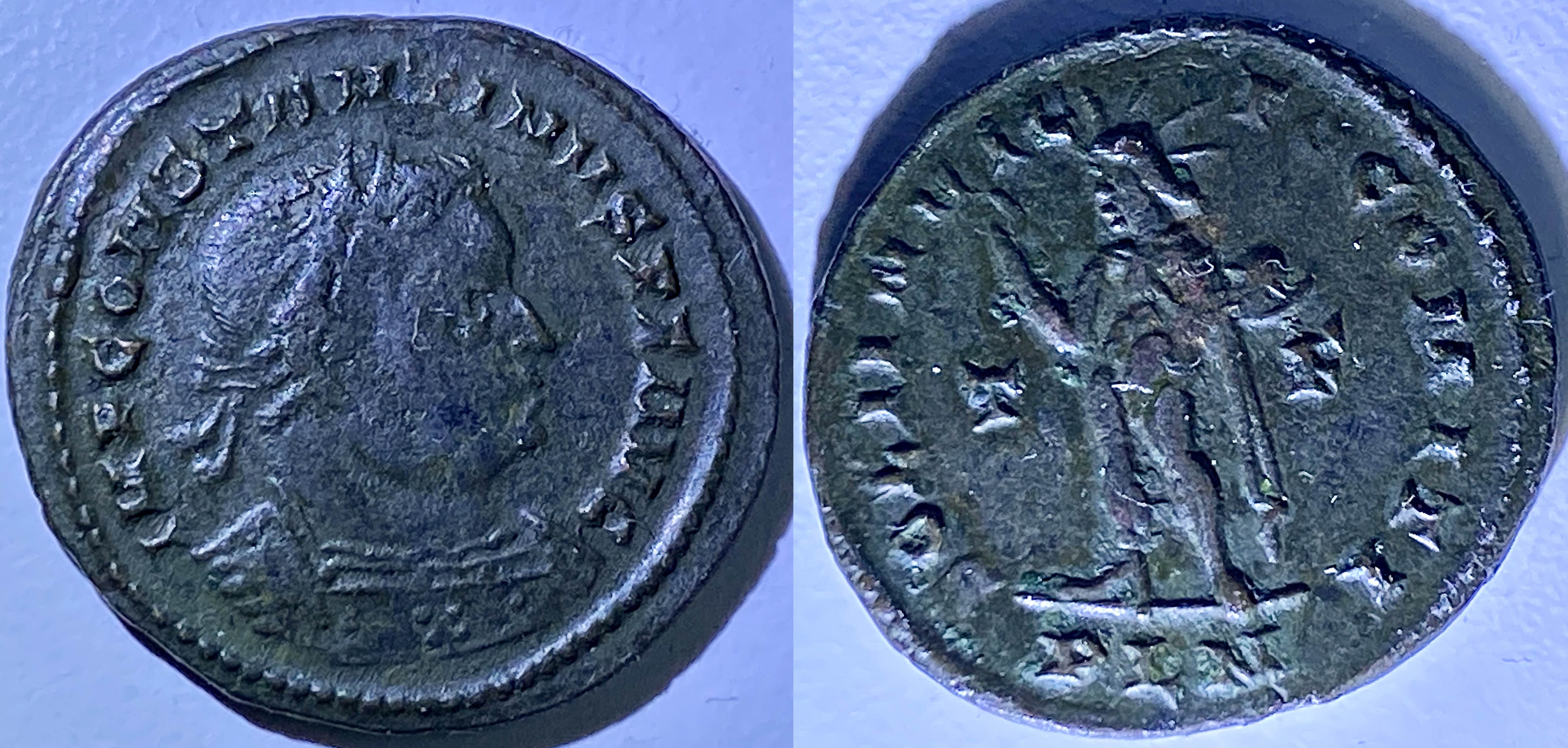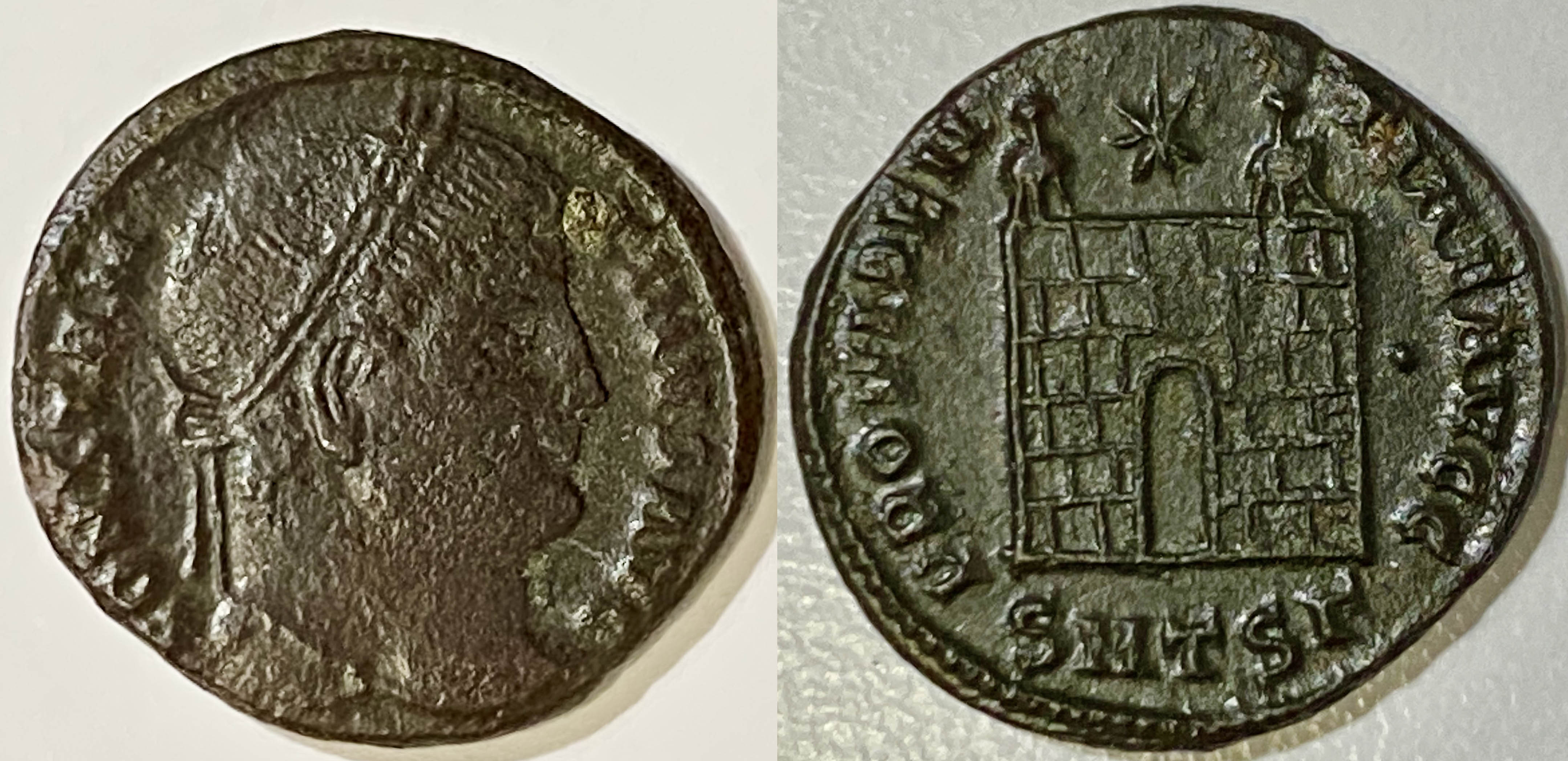 La première pièce est un beau follis réduit (AE3, VG [Very Good], AE [Bronze], 18 x 19 mm, 2.890 g, payé environ $6 le 1985/04/14; die-axis: ↑↓). L’avers nous montre une tête de l’empereur laurée à droite, avec l’inscription latine CONSTAN-TINVS AVG[VSTVS]. Le revers illustre une place forte (constituée de six niveaux et d’une grande ouverture [sur trois niveaux et demi] qui n’a pas de porte) surmontée de deux tourelles (ou soldats?) entourants une étoile (❋), avec l’inscription latine PROVIDEN-TIAE AVGG[VSTORVM] (le double “G” équivaut à un duorum implicite; “[Dédié] à la prévoyance des deux empereurs“), et un SMTS𝞒 en exergue (marque de la troisième officine [Gamma] de l’atelier de Thessalonique [Sacra Moneta TheSsalonica]) et un point (•) dans le champs droit.