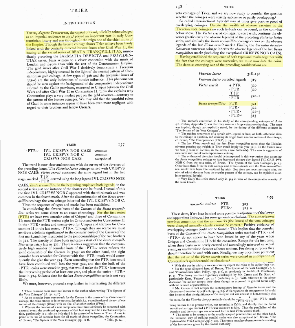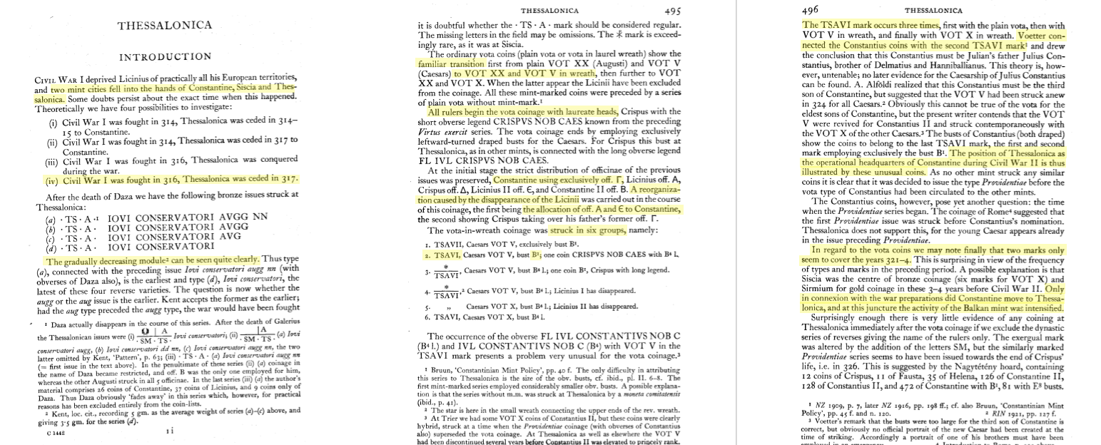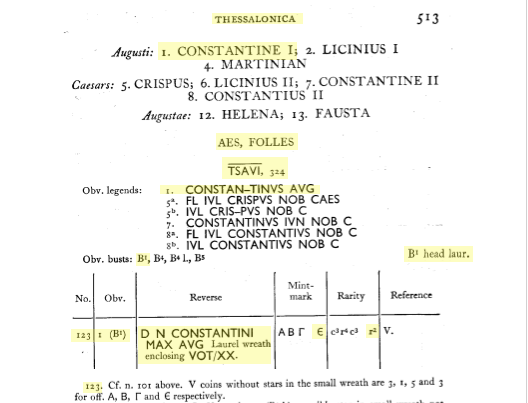 Selon le RIC (Bruun P.M., Ed. by Sutherland C.H.V. & Carson R.A.G., The Roman Imperial Coinage vol. VII: Constantine and Licinius (313-337). London: Spink & Son, 1966, p. 497, 518), cette pièce aurait été frappé par la troisième officine de l’atelier de Thessalonique vers 326-328.