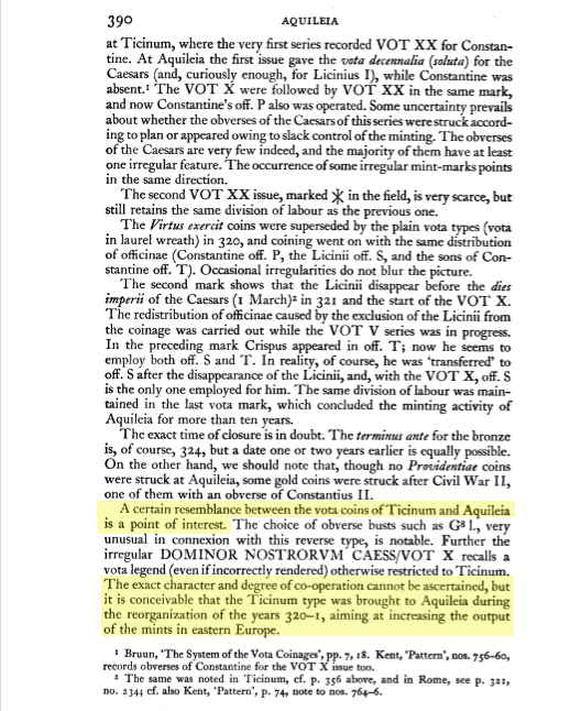 Selon le RIC (op. cit., v. VII, p. 653), cette pièce aurait été frappé par la sixième officine de l’atelier de Cyzique vers 329-330.