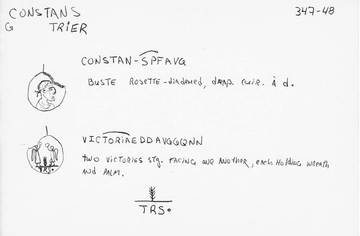 D’après le RIC (Kent, J.P.C.; Ed. by Sutherland C.H.V. & Carson R.A.G., The Roman Imperial Coinage vol. VIII: The Family Of Constantine I (337-364), London: Spink & Son, 1981, pp. 130-134, 152), cette pièce aurait été frappée par la seconde officine de l’atelier de Treveris (Trèves) vers 347-348 EC.