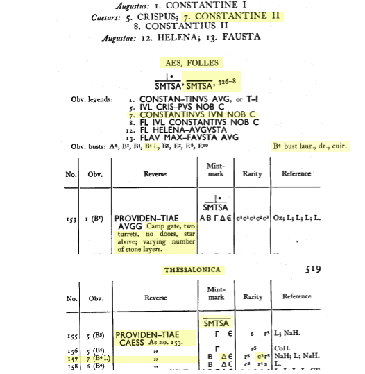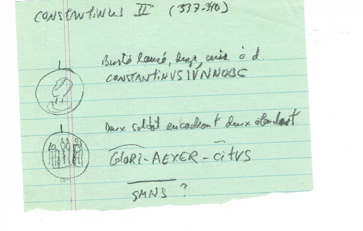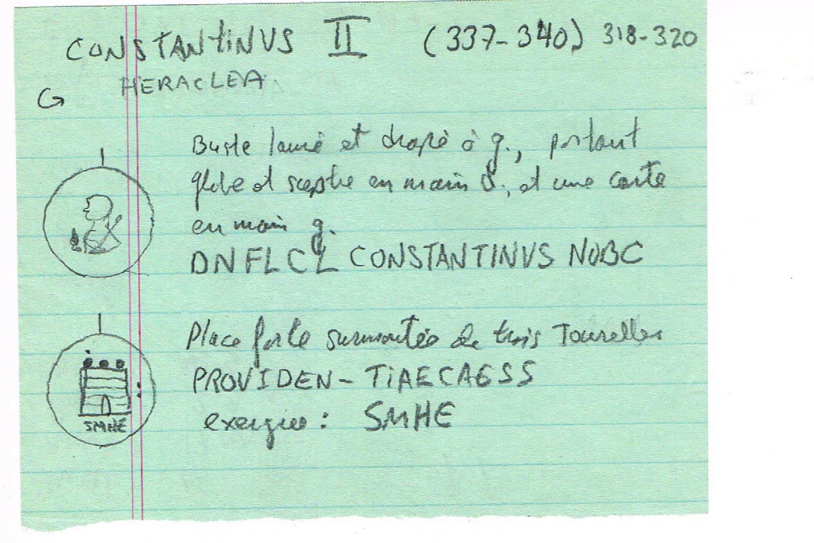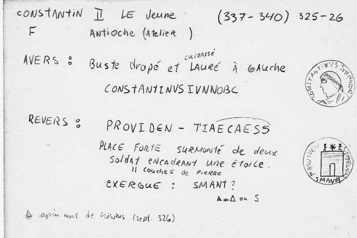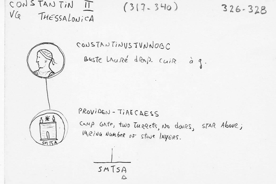Sources: Wikipedia (Constantinus II [FR/EN]), FAC (Constantinus II, Antioch, camp gates, Heraclea, mappa, Providentia, scepter, Thessalonica), ERIC (Constantinus II); RIC vol. VII Heraclea #37, Antioch #65, Thessalonica #157; online ref. pièce 1: CoinArchives (MHTE, ), ConstantineTheGreatCoins (image), WildWinds (text, image); online ref. pièce 2: acsearch, acsearch, CoinArchives, NumisBids, Numismatics, vcoins, WildWinds (text, image); online ref. pièce 3: CoinArchives, numismatics, WildWinds (text1, image1; text2, image2). Voir aussi mes fiches (Heraclea, Antioche, Thessalonique).
