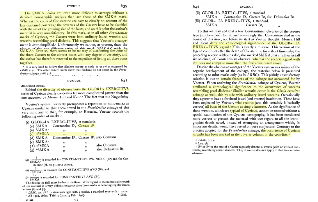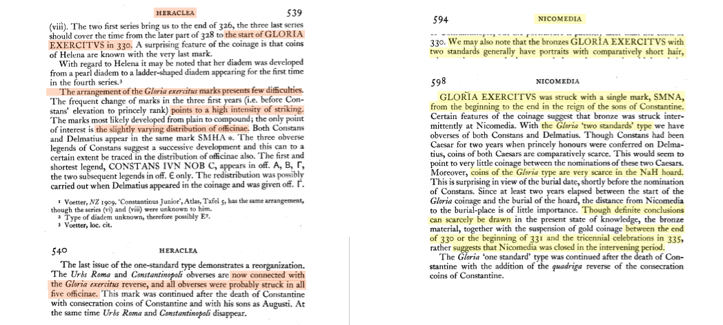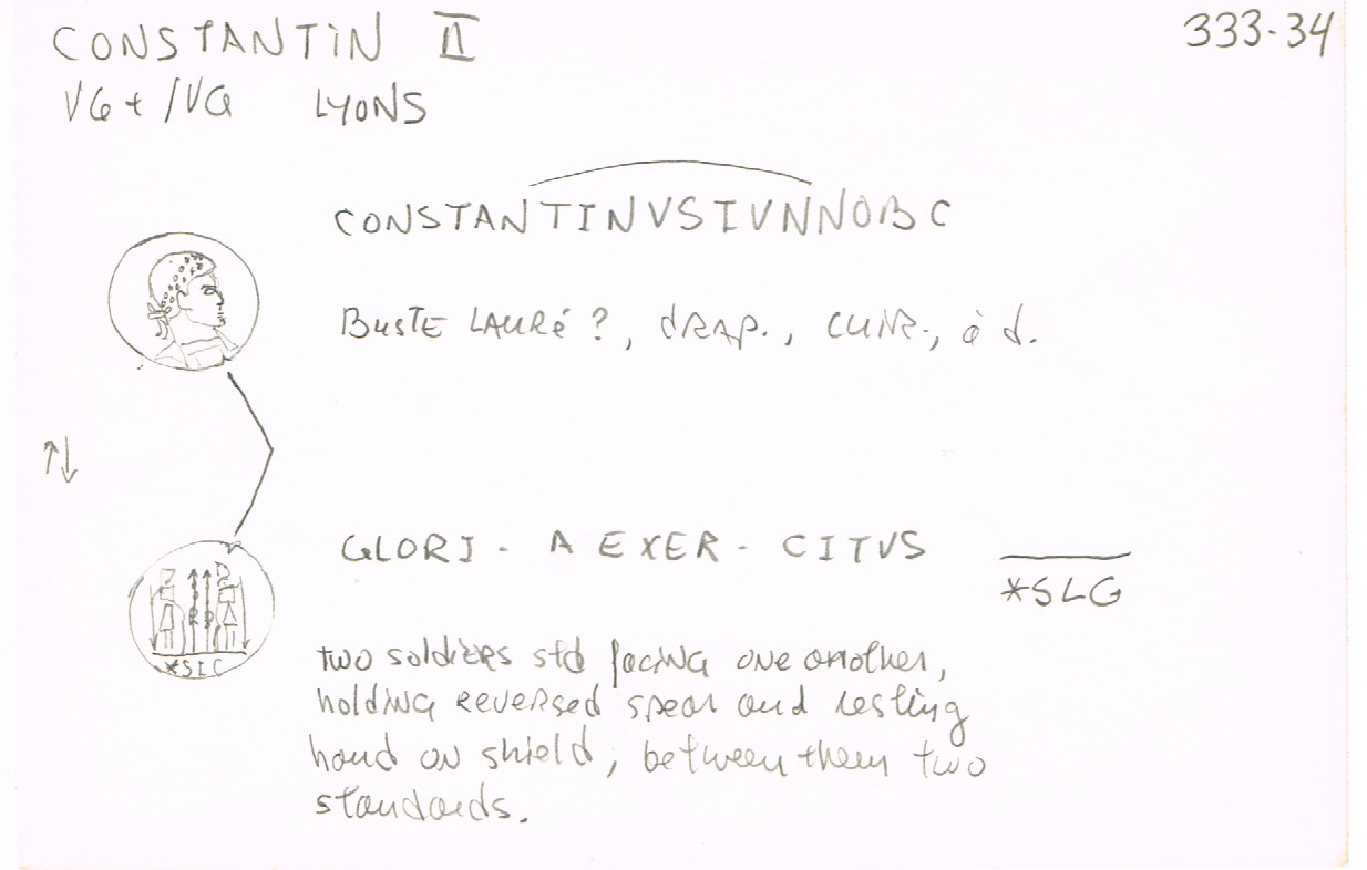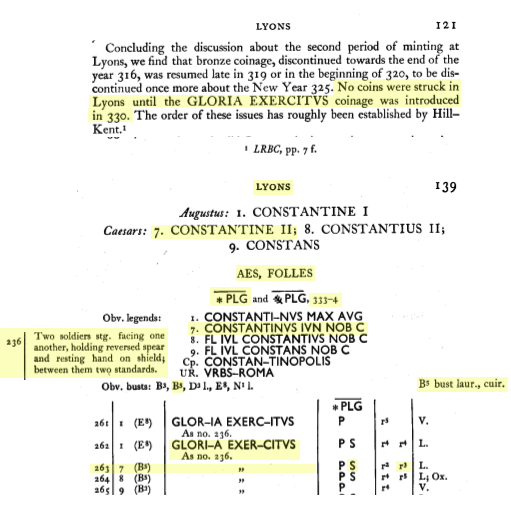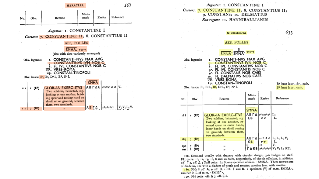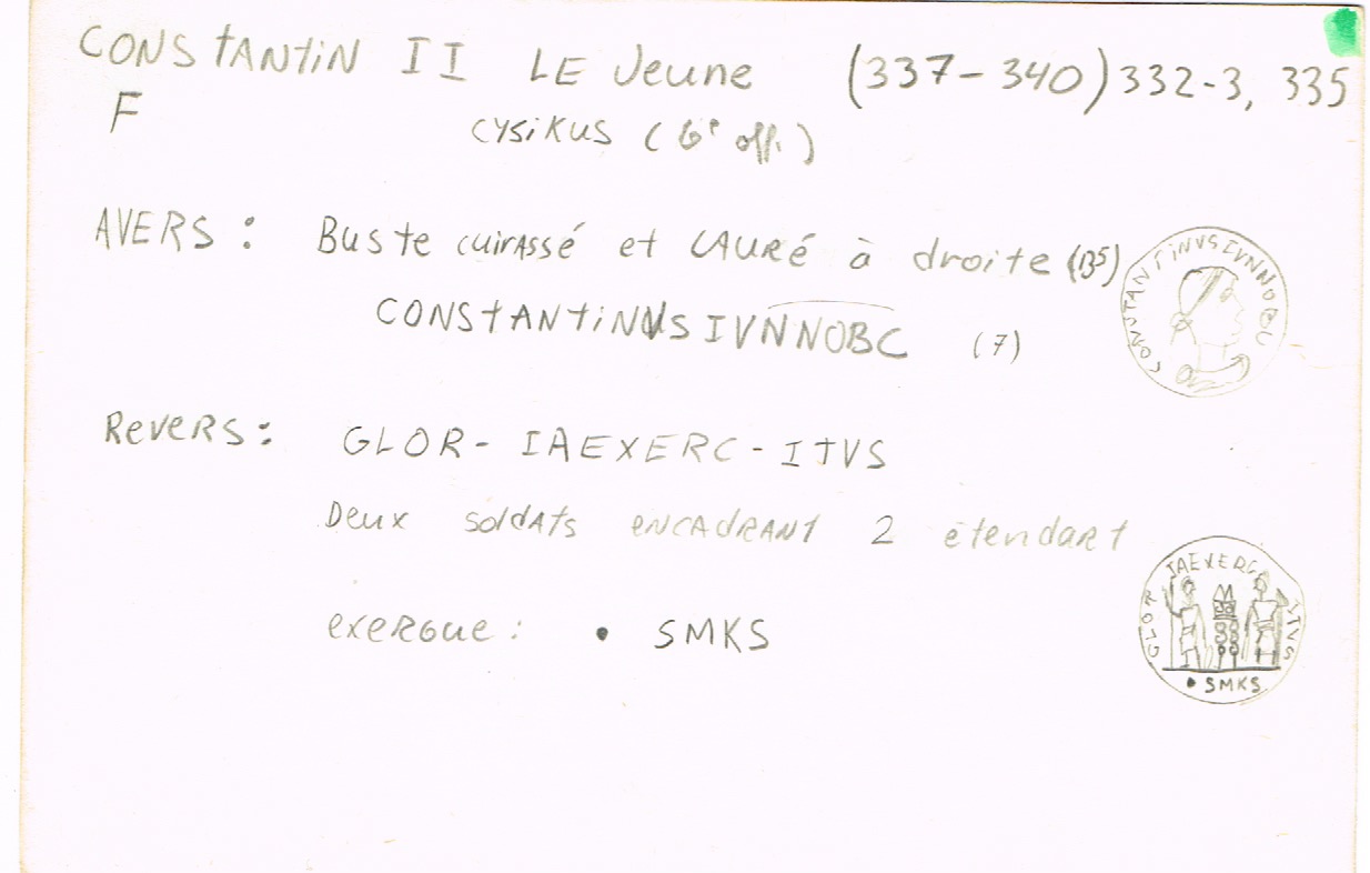 Sources: Wikipedia (Constantinus II [FR/EN], vexillum [FR/EN]), FAC (Constantinus II, Gloria Exercitus, military ensigns, spiculum, vexillum), ERIC (Constantinus II); RIC v. VII, Nicomedia: 189; Cyzicus: 97; Lugdunum: 263; online ref. pièce 1: Google, numismatics (Heraclea, Nicomedia), vcoins, WildWinds (Hereclea: text, image; Nicomedia: text, image);  online ref. pièce 2: Google, acsearch, catawiki, numismatics, WildWinds (text, image S, image Γ, image Δ, image E);  online ref. pièce 3: Google, acsearch, coinsha, MA-shops, numismatics, WildWinds (text, image), yorkcoins. Voir aussi mes fiches (Nicomedia, Cyzicus, Lugdunum).