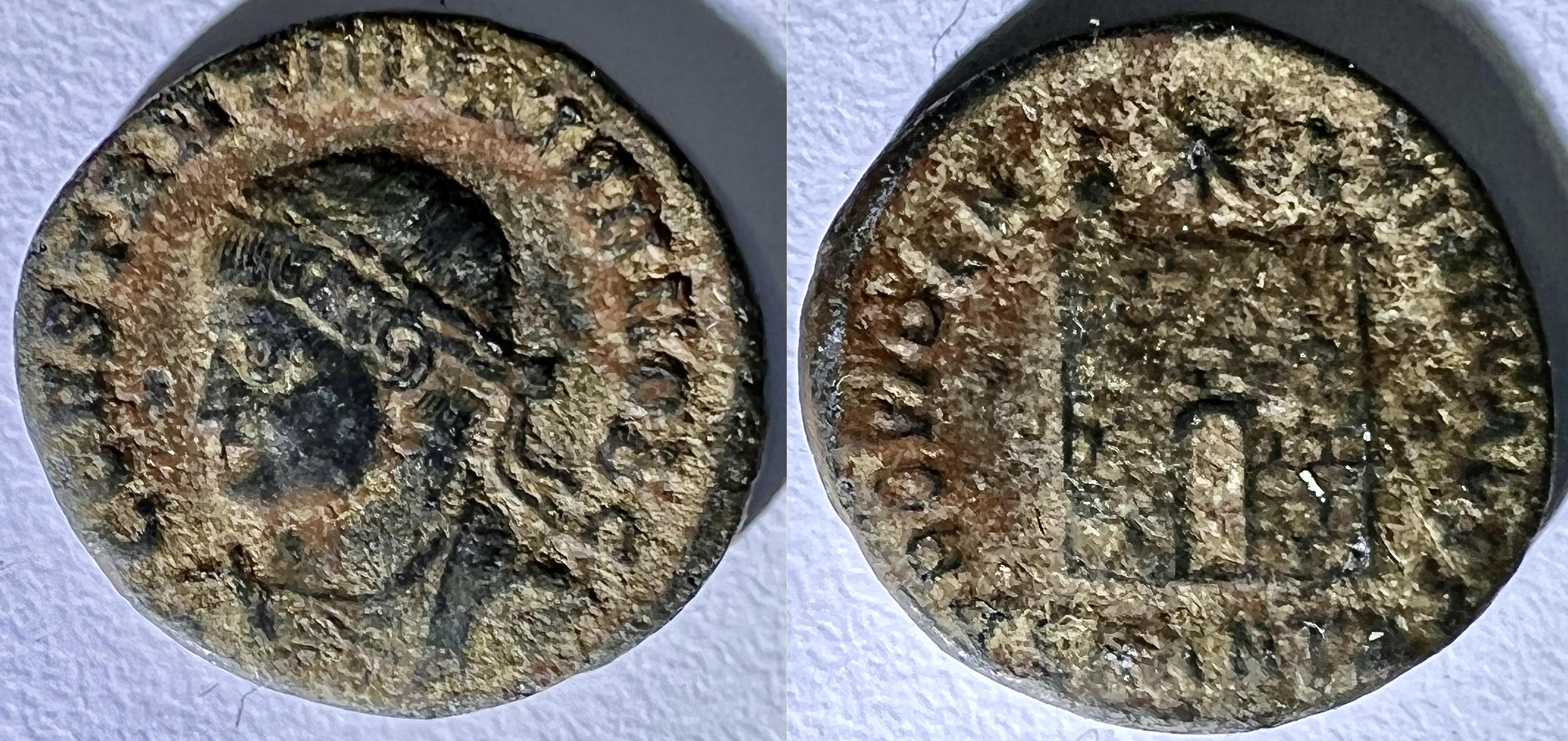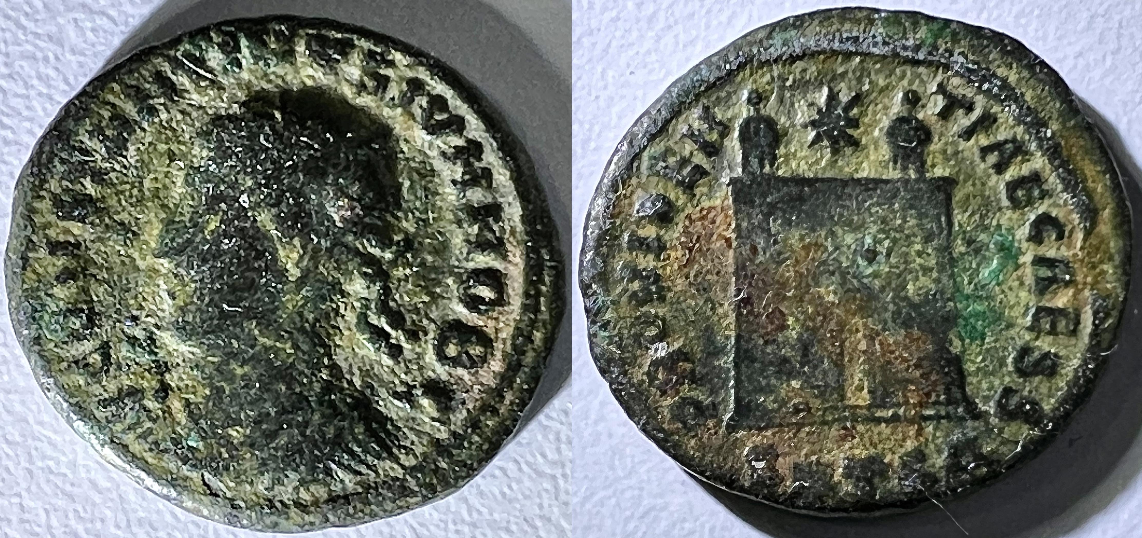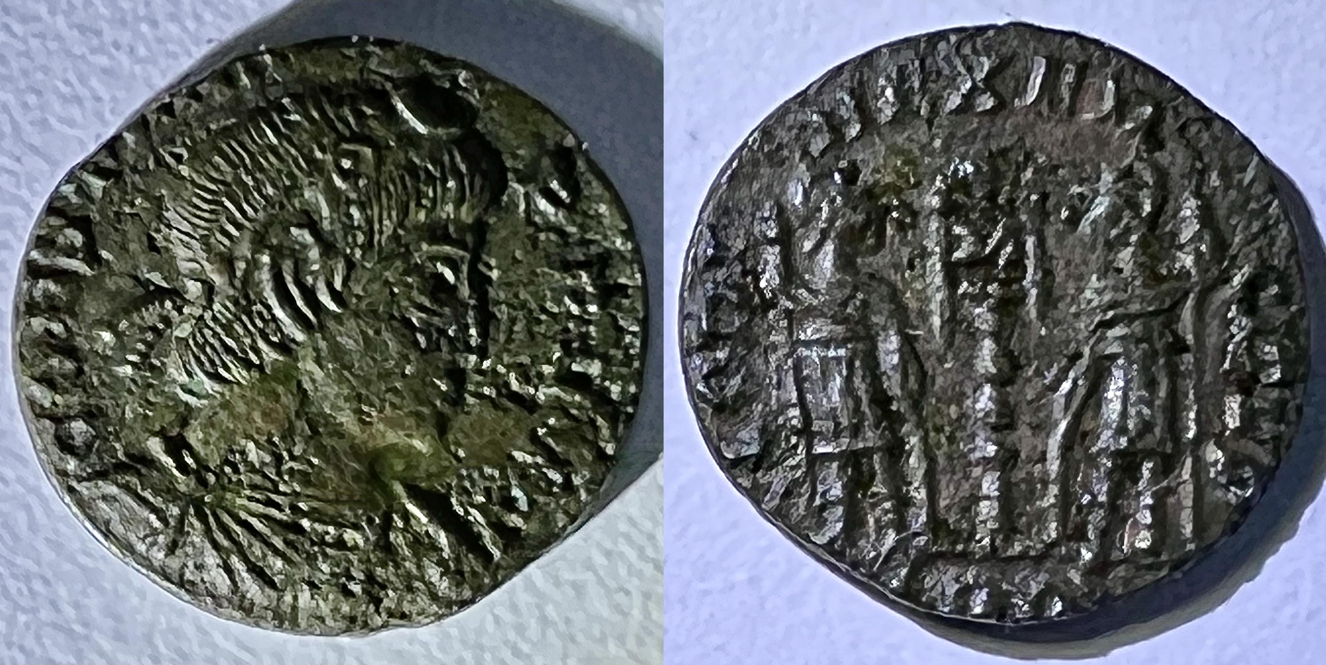 Il semble que les pièces du bas-empire me sont de plus en plus de difficiles à identifier avec exactitude car elles sont en moins bon état de conservation. Est-ce parce qu’elles ont circulé plus longtemps? Ou parce que la qualité de la frappe était moins bonne? Ou simplement parce que j’ai eu moins de chance avec l’acquisition de ces lots là? Je ne saurais dire…