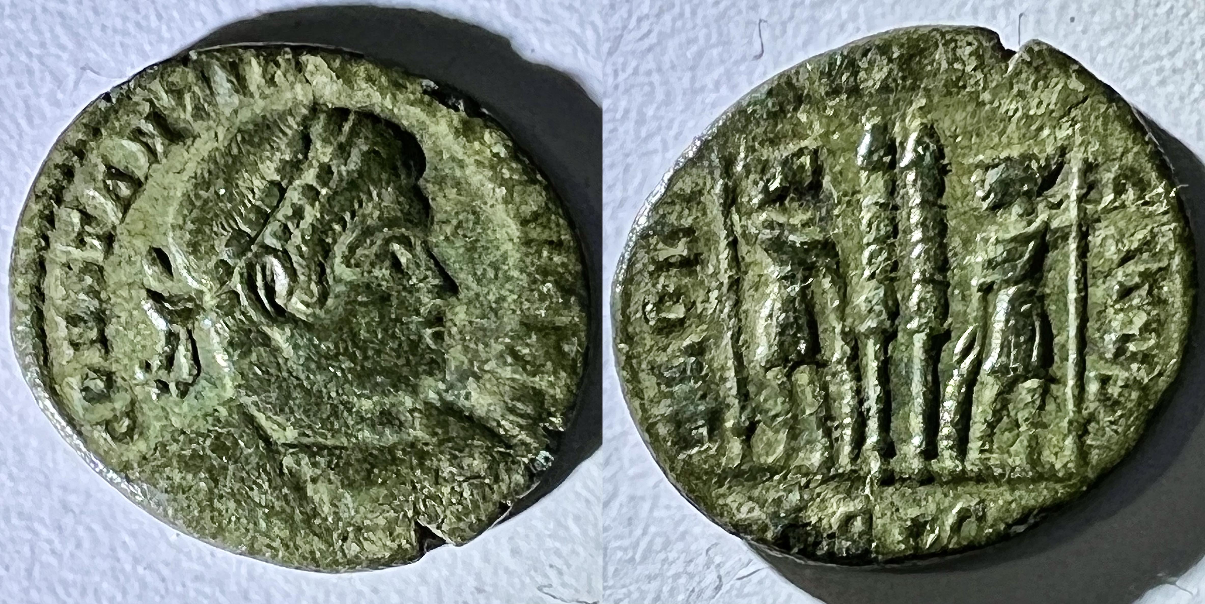 IMG_1226-1232La première de ces pièces est un très beau follis réduit / nummus (F / VG [Fine / Very Good], AE3/4, AE / BI [Bronze / Billon], 14 x 15 mm, 1.533 g, payé environ $6 le 1985/06/16, le revers était couvert de concrétions résineuse et a exceptionnellement nécessité un curetage et un nettoyage à la gomme; die-axis: ↑↓). L’avers présente un buste de l’empereur portant un diadème à rosettes, drapé et cuirassé à droite, avec l’inscription latine CONSTANS P[IVS] F[FELIX] AVG[VSTVS] (“Constans, Auguste Pieux et Heureux”). Le revers illustre deux soldats casqués et cuirassés, dos à dos mais se regardant l’un l’autre, tenant une lance (spiculum) renversée dans la main droite et la main gauche reposant sur un bouclier, entourants un étendard (vexillum) inscrit d’un “M”, avec l’inscription latine GLORI-A EXER-CITVS (“à la gloire de l’armée”) et un TRP suivi d’un croissant en exergue (marque de la première officine [P = Primus] de l’atelier de Augusta Treverorum [TR]; le croissant serait une marque de séquence).
