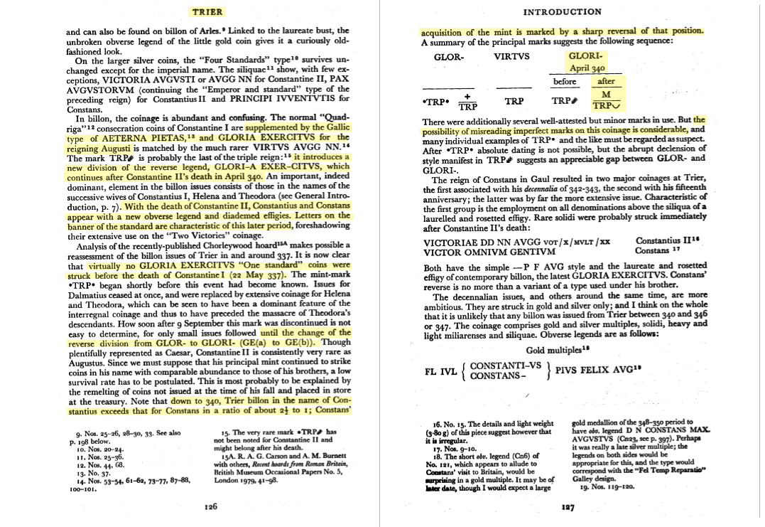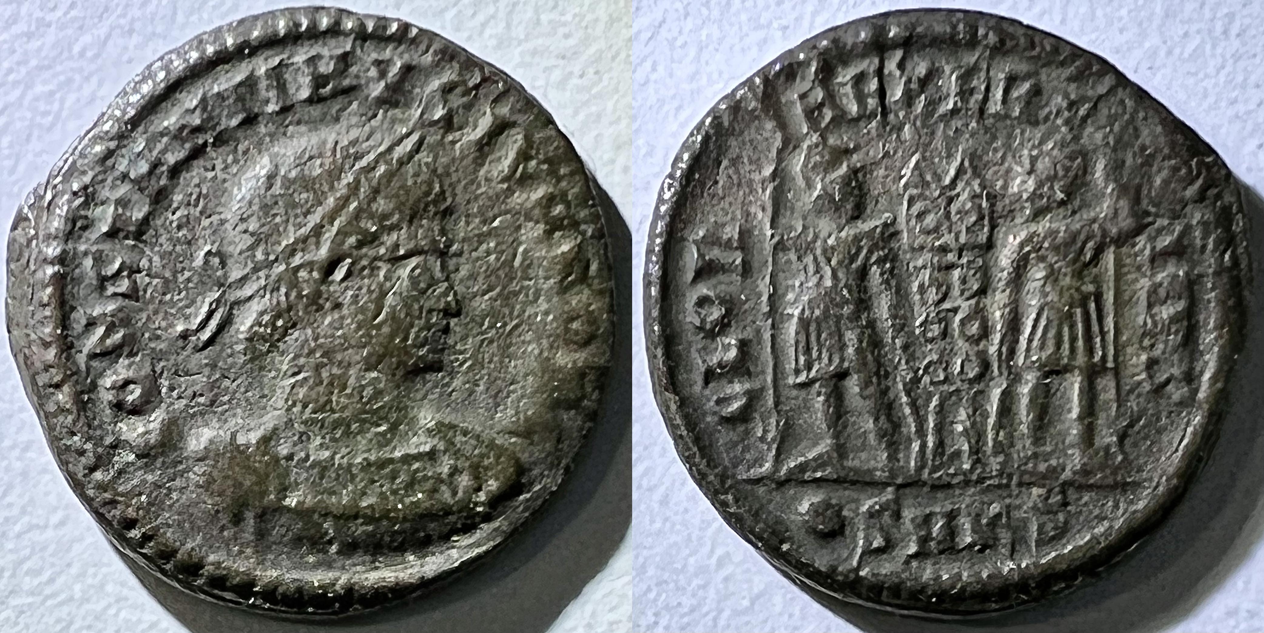 D’après le RIC (op. cit., pp. 130-134, 151-152), cette pièce aurait possiblement été frappée par l’atelier de Treveris (Trèves) vers 347-348 EC. Si statistiquement il y a plus de chance que ce soit une pièce de Constans, j’admet cependant que cela pourrait tout aussi bien être une pièce de Constantius II…