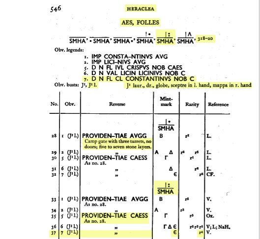 Selon le RIC (Bruun P.M., Ed. by Sutherland C.H.V. & Carson R.A.G., The Roman Imperial Coinage vol. VII: Constantine and Licinius (313-337). London: Spink & Son, 1966, pp. 535, 546), cette pièce aurait été frappée par la cinquième officine de l’atelier d’Héraclée en 318-320 EC. Ce serait une pièce rare (r4 = deux à trois pièces connues).