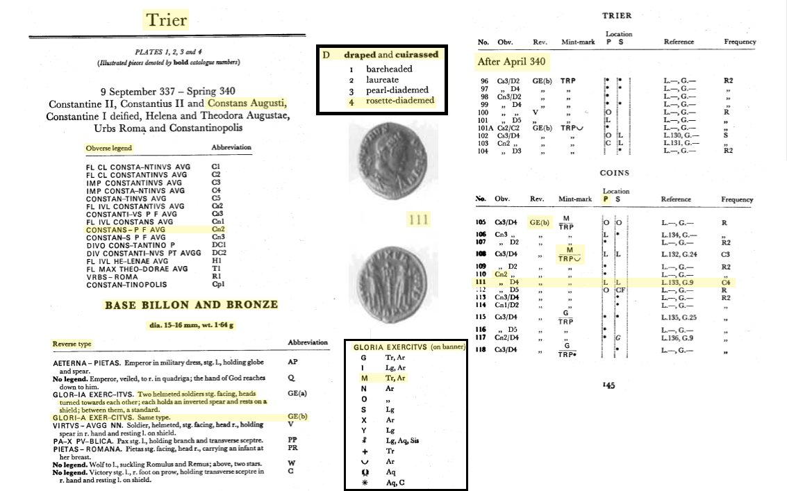 Sources: Wikipedia (Constans [FR/EN]), FAC (Constans, Gloria Exercitus, military ensigns, spiculum, vexillum), ERIC (Constans); RIC v. VIII, Trier: 111; online ref. pièce 1: acsearch, acsearch, chijanofuji, CoinTalk, CtGc,  Google, numisbids, numismatics, vcoins, WildWinds (RIC 111: text1, image1; text2, image2; RIC 112: text, image). Voir aussi ma fiche.