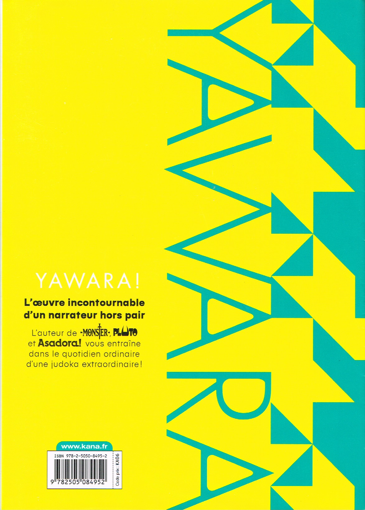 Yawara t. 1, par Naoki Urasawa. Bruxelles: Kana, septembre 2020. 310 pages, B&W (23 pages en couleurs ou bichromie), 14.8 x 21 cm, 15.00 € / $C 26.95, ISBN 978-2-5050-8495-2, Pour un lectorat adolescent (12+). Extraits disponibles. stars-3-5