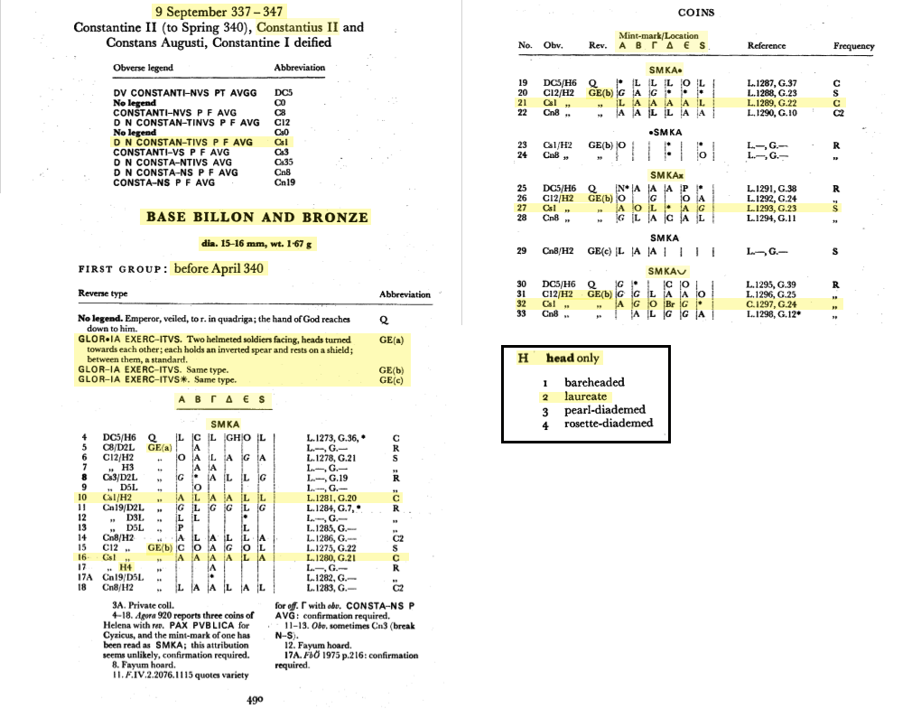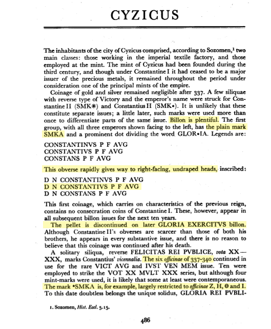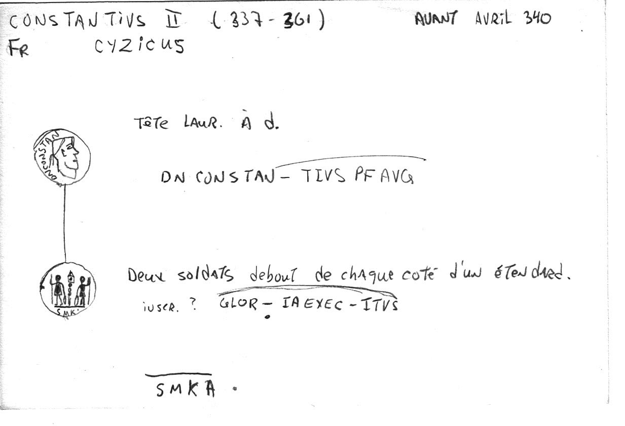 D’après le RIC (Kent, J.P.C.; Ed. by Sutherland C.H.V. & Carson R.A.G., The Roman Imperial Coinage vol. VIII: The Family Of Constantine I (337-364), London: Spink & Son, 1981, p. 486, 490-91), cette pièce aurait été frappée par l’atelier de Cyzique entre septembre 337 et avril 340 EC.
