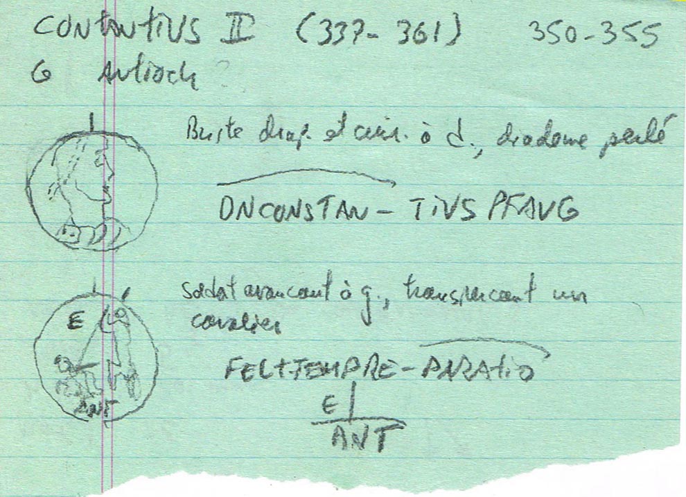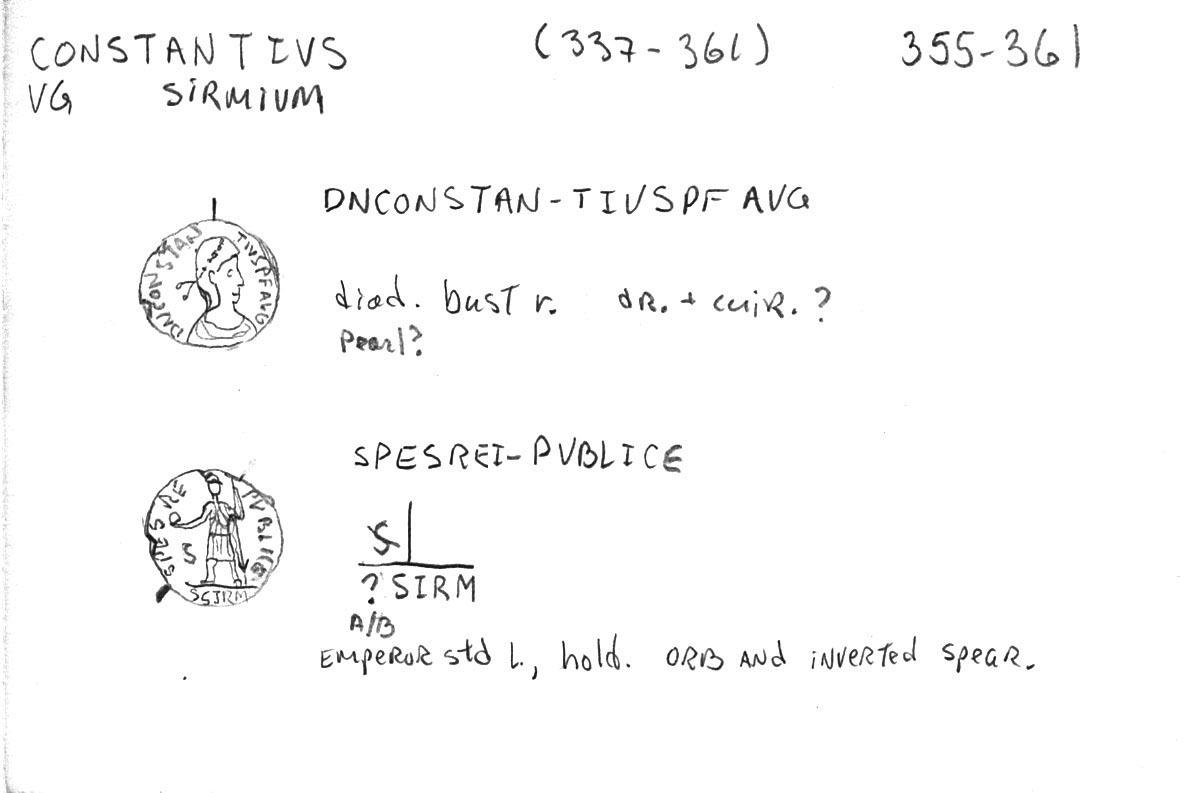 Cette pièce est un beau follis réduit / nummus (VG [Very Good], AE4, AE / BI [Bronze / Billon], 17 x 16 mm, 1.983 g, payé environ $8 le 1985/12/17, caractérisée par une patine brunâtre; die-axis: ↑↙︎). L’avers représente un buste de l’empereur portant un diadème de perles, drapé et cuirassé à droite, avec l’inscription latine D[OMINVS] N[OSTER] CONSTAN-TIVS P[IVS] F[ELIX] AVG[VSTVS] (“Notre Seigneur Constantius, Pieux Heureux Auguste”). Le revers illustre l’empereur debout à gauche, casqué et cuirassé, tenant un globe dans la main droite et une lance (spiculum) renversée dans la gauche, avec l’inscription latine SPES REI-PVBLIC[A]E (“l’Espoir de la République”), un [?]SIRM en exergue (marque de l’atelier de Sirmium [SIRM] précédée d’une marque d’officine illisible, mais les seules possibilités sont “A” ou “B”) et un S (ou un S frappé d’un trait?) dans le champs gauche (marque de séquence?).