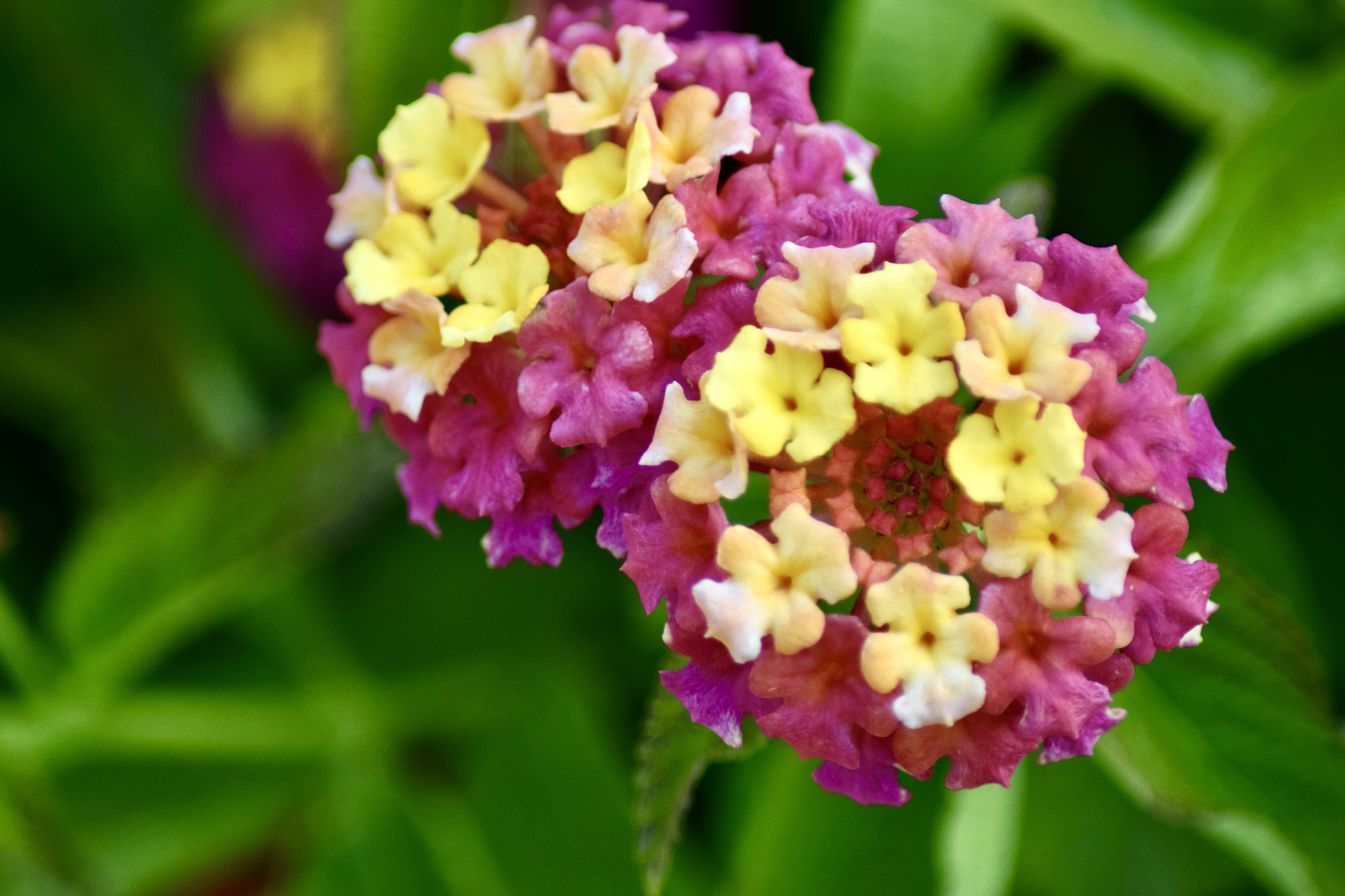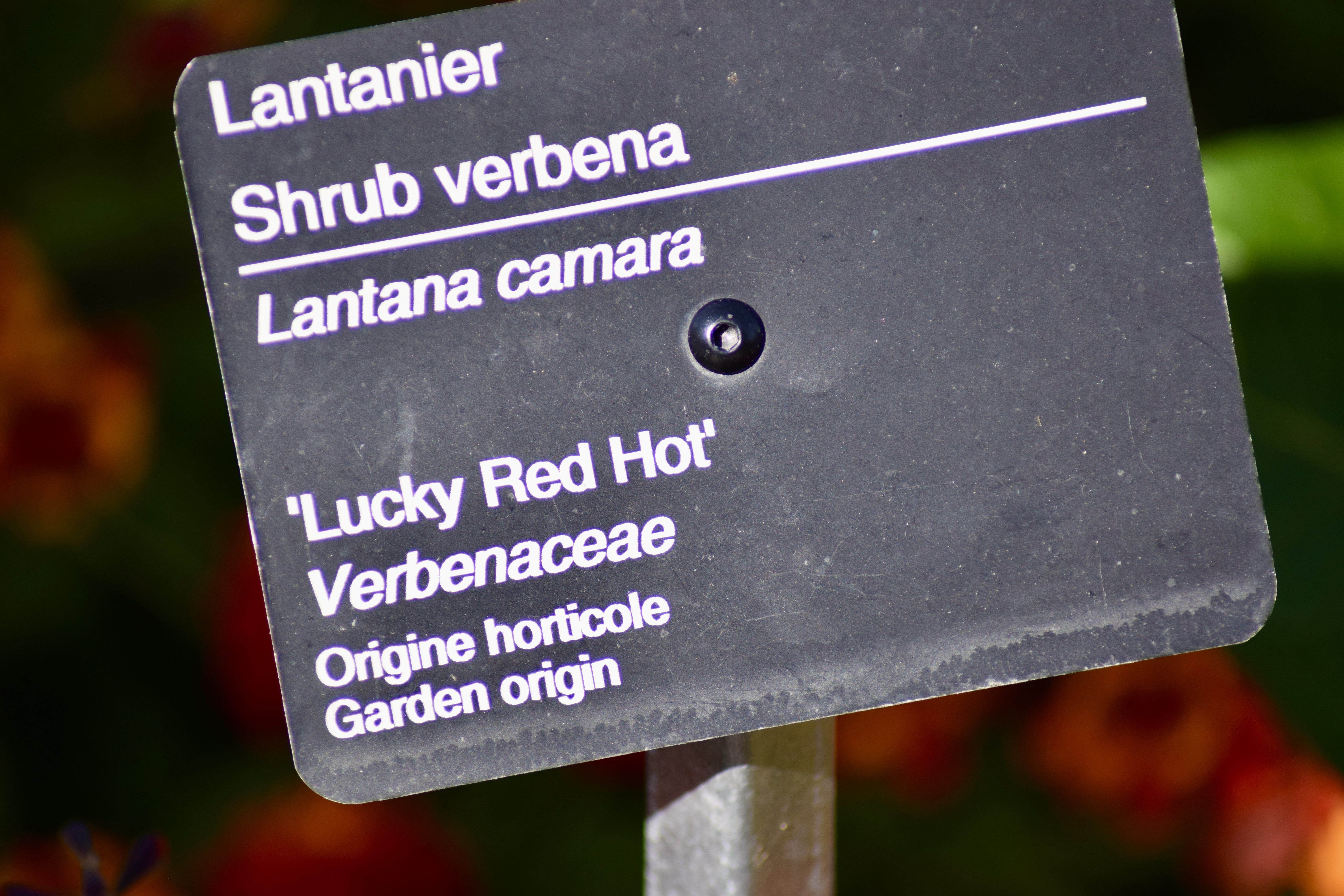 Le Lantanier (appelé “Shrub verbena” en anglais ou ランタナ en japonais) est une espèce de plante qui appartient à la division des Magnoliophyta (ou Angiospermae, i.e. les plante à fleurs), à la classe des Magnoliopsida (ou Dicotyledonae), à la sous-classe des Asteridae, à l’ordre des Lamiales, à la famille des Verbenaceae (les verveines, qui incluent trente-deux genres, qui se divisent en huit cents espèces) et au genre Lantana (qui regroupe environ cent cinquante espèces). Natif des tropiques d’Amériques du Sud et d’Afrique, il a cependant été introduit dans de nombreuses autres régions au climat chaud. Son nom provient de la Viorne lantane (à laquelle elle ressemble) et du grec καμάρα qui signifie “voûté”. Ici il s’agit du cultivar “Lucky Red Hot”.