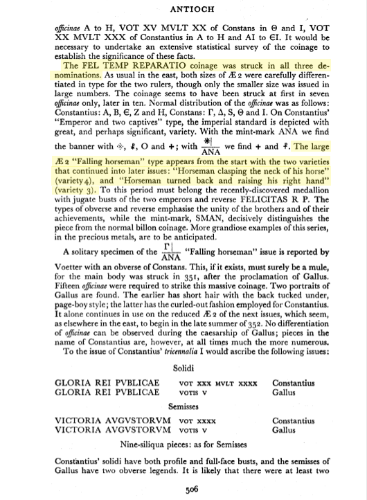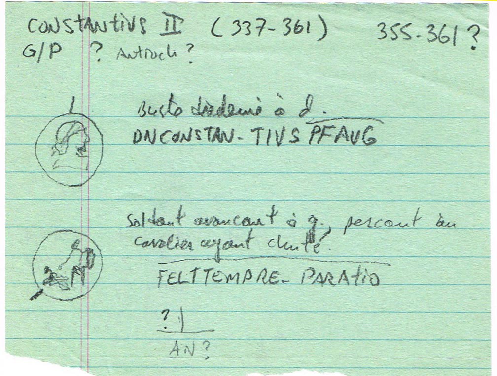 La semaine prochaine nous concluons notre survol de mes pièces de monnaie de Constantius II avec trois pièces d’un type de revers que je ne vous ai pas encore présenté: la représentation d’un légionnaire frappant de sa lance un cavalier barbare dont la monture est tombée (the “Fallen Horseman”) avec l’inscription FELicium TEMPorum REPARATIO (“le retour des temps heureux”).