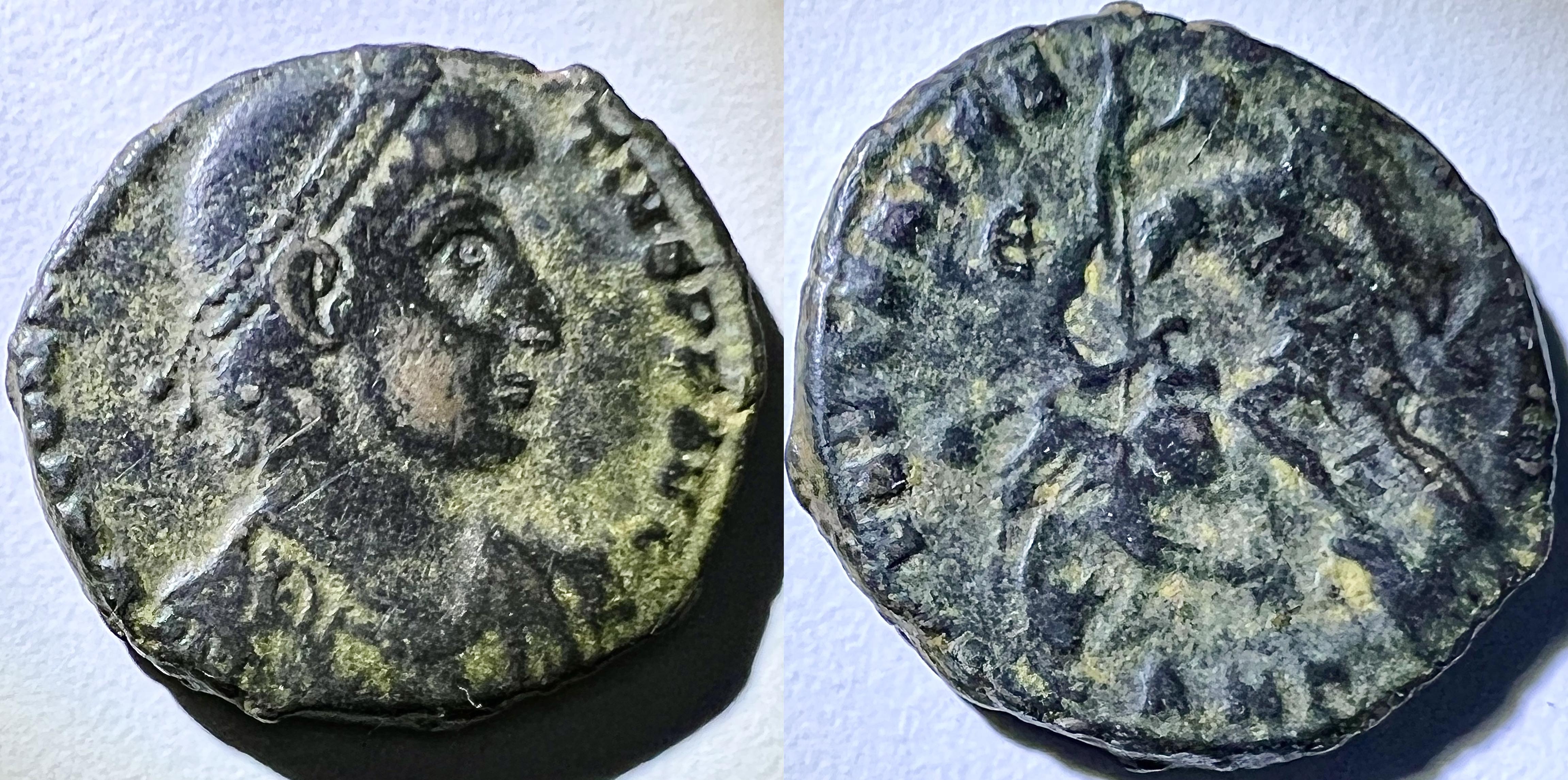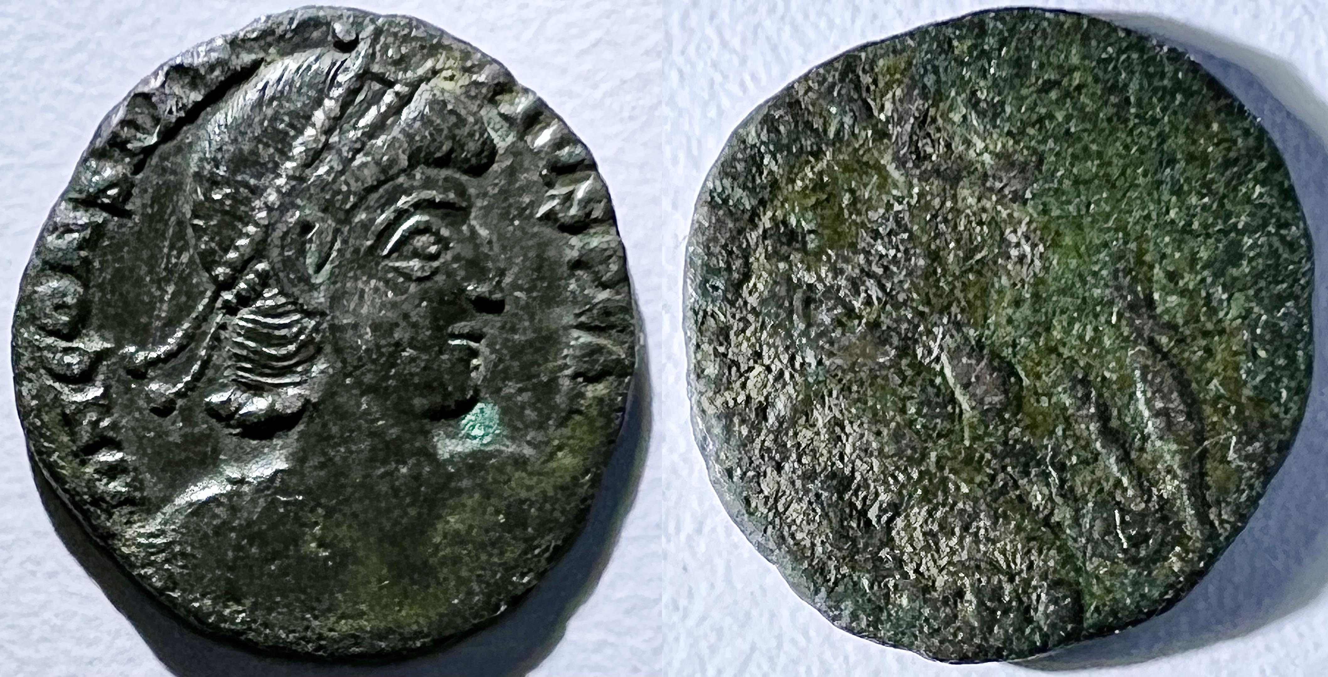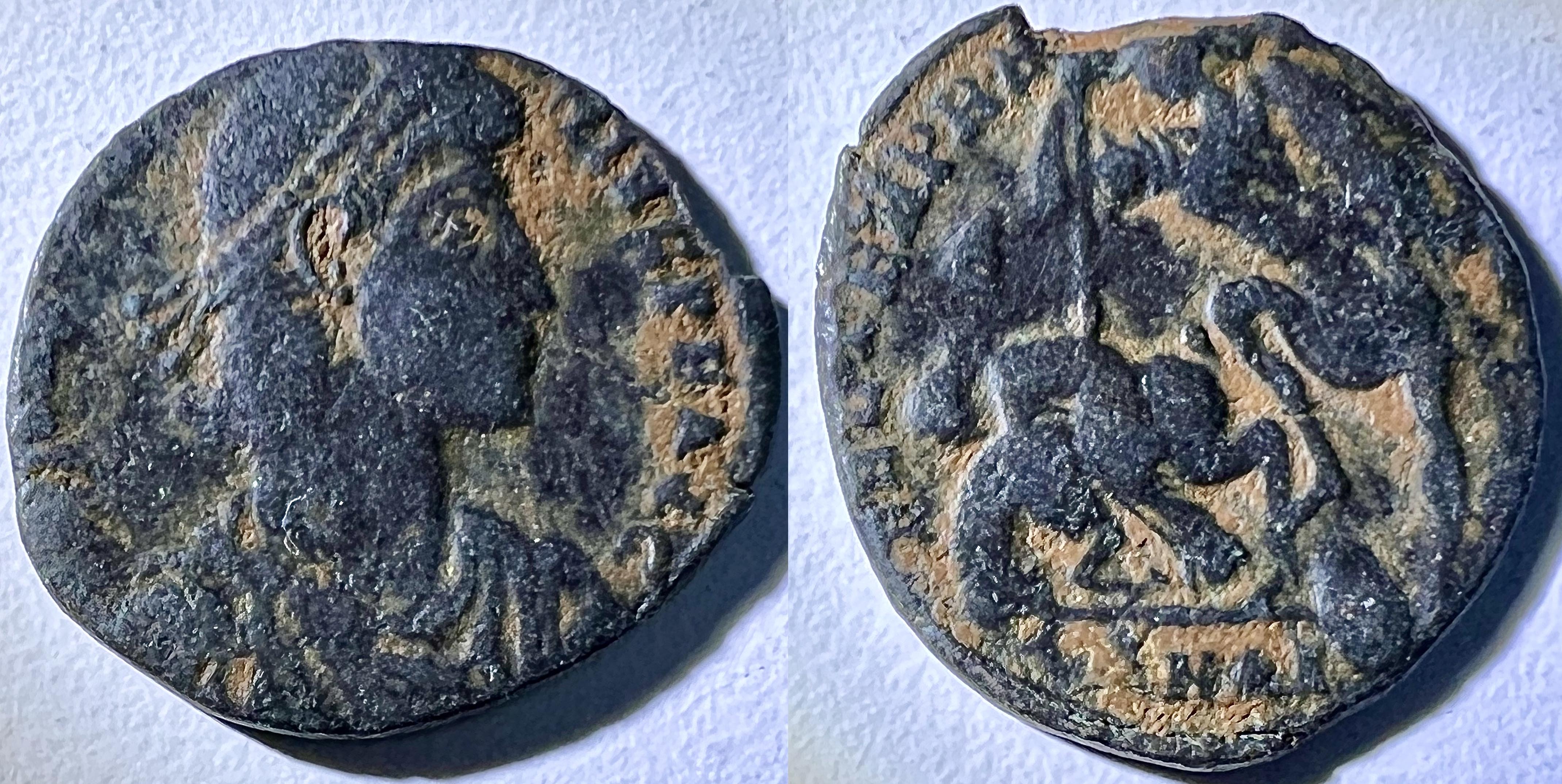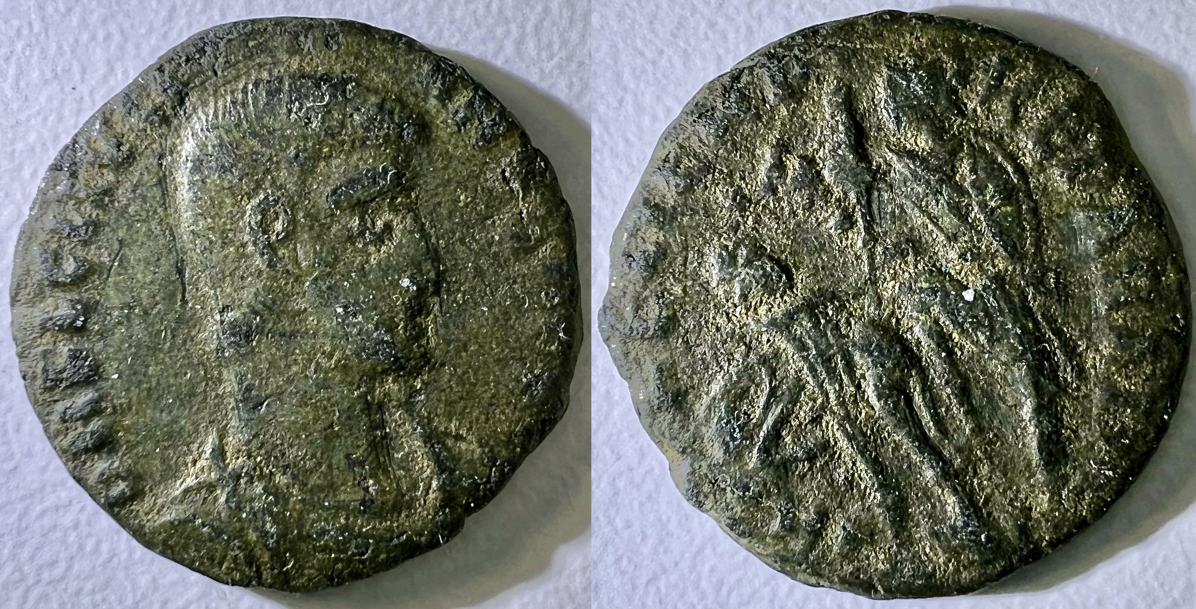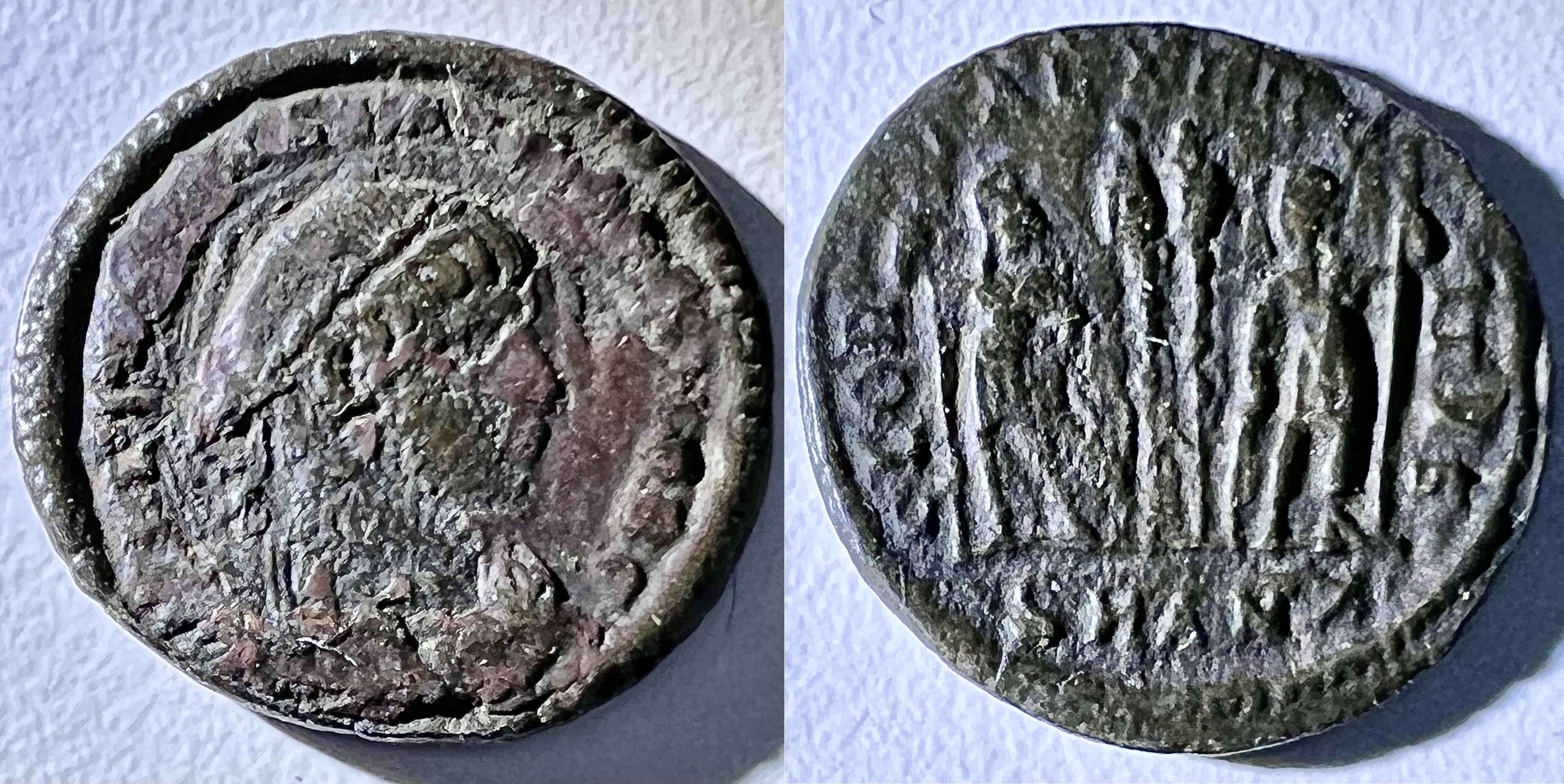 La seconde pièce est un follis réduit / nummus passable (Fr [Fair], AE4, AE / BI [Bronze / Billon], 13 mm, 1.753 g, payé environ $5 le 1985/01/06, caractérisé par le fait que les contours du visage de l’empereur ont été accentué en les gravant avec une pointe; die-axis: ↑↓). L’avers représente un une tête de l’empereur laurée à droite, avec l’inscription latine présumée D[OMINVS] N[OSTER] CONSTAN-TIVS P[IVS] F[ELIX] AVG[VSTVS] (“Notre Seigneur Constantius, Pieux et Heureux Auguste”). Le revers illustre deux soldats casqués et cuirassés, dos à dos mais se regardant l’un l’autre, tenant une lance (spiculum) renversée dans la main droite et la main gauche reposant sur un bouclier, entourants un étendard (vexillum), avec l’inscription latine illisible GLOR-IA EXERC-ITVS (“à la gloire de l’armée”) et ce qui semble être un SMK? en exergue (marque de la énième officine [six officines possibles: A, B, 𝚪, 𝚫, E, et S] de l’atelier de Cyzique [Sacra Moneta Kyzici]).