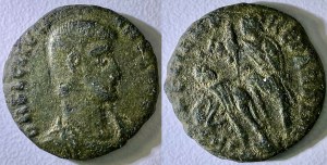 La première pièce est un assez beau follis réduit / nummus (G [Good], AE3, AE / BI [Bronze / Billon], 17 mm, 2.231 g, payé environ $6 le 1985/06/16, dont l’avers comporte un important dépôt rougeâtre; die-axis: ↑↓). L’avers représente un buste du César lauré et cuirassé à droite, avec l’inscription latine FL[AVIVS] IVL[IVS] CONSTANTIVS NOB[ILISSIMVS] C[AESAR] (“Flavius Julius Constantius, Très Noble César”). Le revers illustre deux soldats casqués et cuirassés, dos à dos mais se regardant l’un l’autre, tenant une lance (spiculum) renversée dans la main droite et la main gauche reposant sur un bouclier, entourants deux étendards (vexillum), avec l’inscription latine GLOR-IA EXERC-ITVS (“à la gloire de l’armée”) et un SMAN? en exergue (marque de la énième officine [cela ressemble plus à un “X” mais en fait ne peut être que soit un Epsilon (E, cinq), un Sigma (S, six), un Zêta (Z, sept) ou un Êta (H, huit)] de l’atelier d’Antioche [Sacra Moneta ANtiochia]).