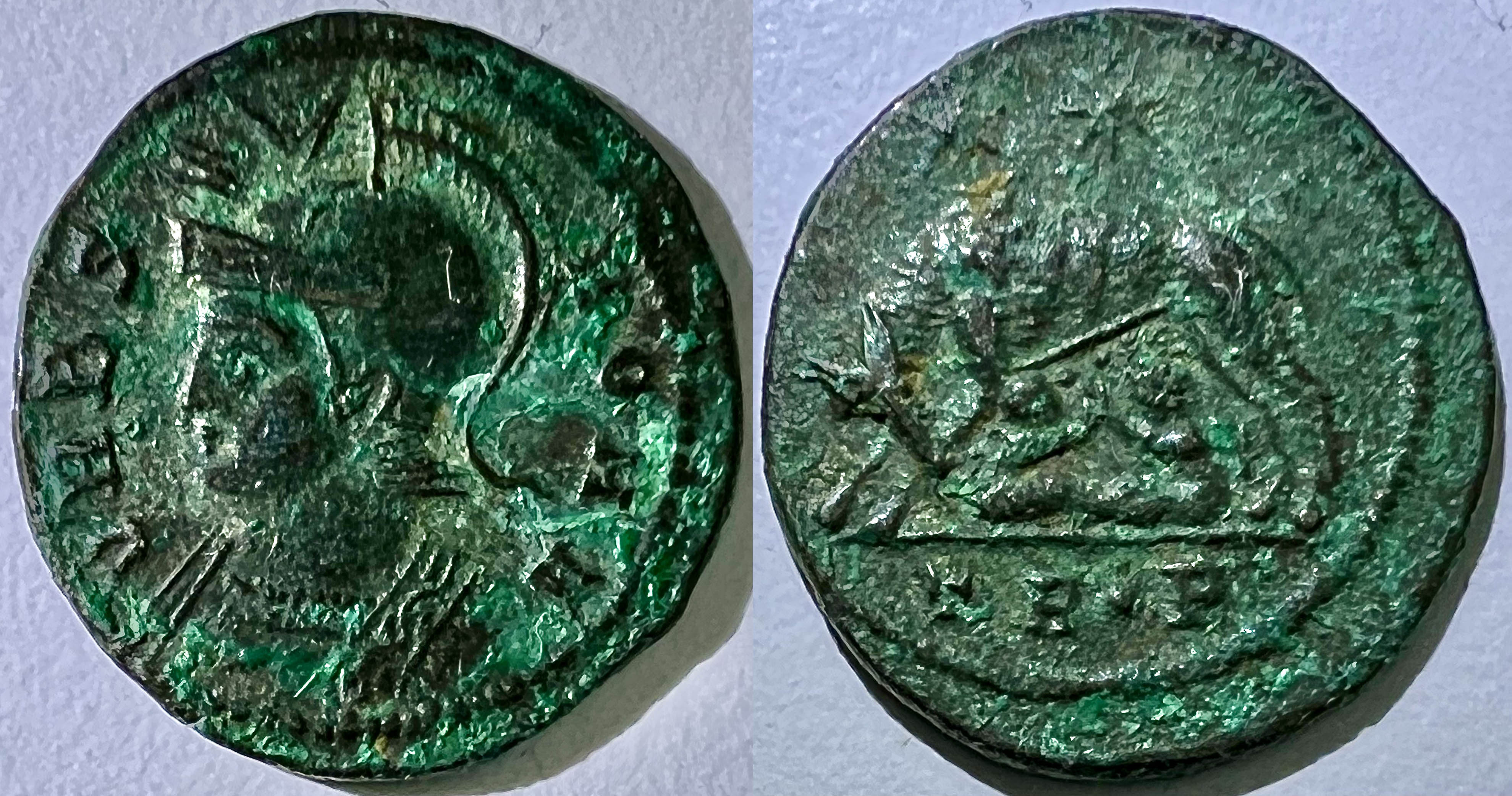 Le second specimen est une pièce commémorative de la ville de Rome. C’est un très beau nummus ou demi-centenionalis (F [Fine], AE3, AE [Bronze], 17 x 18 mm, 1.955 g, payé environ $6 le 1985/06/16, patine verdâtre le flan étant presqu’entièrement couvert de vert-de-gris; die-axis: ↑↓). L’avers présente un buste de Roma à gauche, cuirassé et drapé d’un manteau impérial, portant un casque à cimier, avec l’inscription latine VRBS – ROMA (“Ville de Rome”). Le revers illustre une louve debout à gauche, la tête tournée en arrière vers la droite, allaitant les jumeaux Romulus et Remus enfants, avec au-dessus deux étoiles (représentant les Dioscures Castor et Pollux de la constellation des Gémeaux), avec un TR • P en exergue (marque de la première officine [P = Primus] de l’atelier de Treveris [TR]). Il semble parfois y avoir, comme marque de séquence, un dessin sur l’épaule de la louve (une main, une étoile, un double croissant, etc.) mais s’il y en a un ici il est impossible de le distinguer.