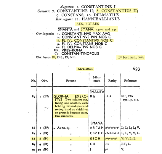 D’après le RIC (Bruun P.M., Ed. by Sutherland C.H.V. & Carson R.A.G., The Roman Imperial Coinage vol. VII: Constantine and Licinius (313-337). London: Spink & Son, 1966, p. 693, 697), cette pièce aurait été frappée par la dixième officine de l’atelier d’Antioche. Il y a deux émission possible: l’une en 330-333, 335 EC (RIC 92) et l’autre en 335-337 EC. Toutefois, la comparaison des portraits de Constantinople (particulièrement les détails du casque) et le fait que la seconde émission est plus rare me porte à croire que ma pièce appartient probablement à la première émission.