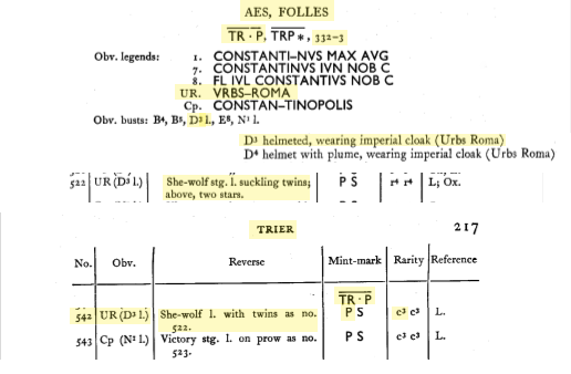[ Translate ]Sources: Wikipedia (Constantinople [FR/EN], Rome [FR/EN]), FAC (Constantinopolis, Urbs Roma); RIC v. VII, Antioch: 92 / 114; Trier: 547; Online Ref. (Constantinopolis): Google, AC, AC, CGC, CoinArchives, MintageWorld, numismatics, vcoins, vcoins, WildWinds (RIC 92: text, image; RIC 114: text, image). Online Ref. (Roma): Google, acsearch, CGC, CoinArchives, CoinTalk, FAC, numismatics, numista, WildWinds (text, image). Voir aussi mes fiches (Constantinopolis, Roma).