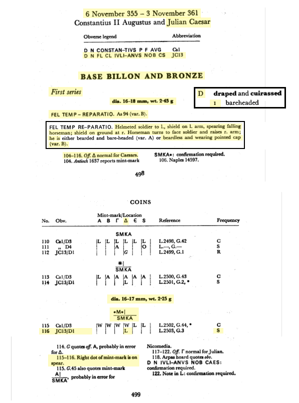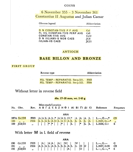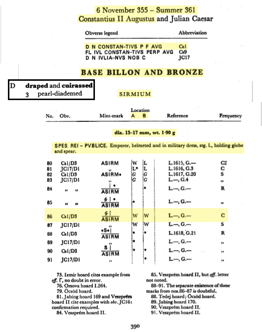 D’après le RIC (Kent, J.P.C.; Ed. by Sutherland C.H.V. & Carson R.A.G., The Roman Imperial Coinage vol. VIII: The Family Of Constantine I (337-364), London: Spink & Son, 1981, p. 390), cette pièce aurait été frappée par l’atelier de Sirmium vers 355-361 EC.