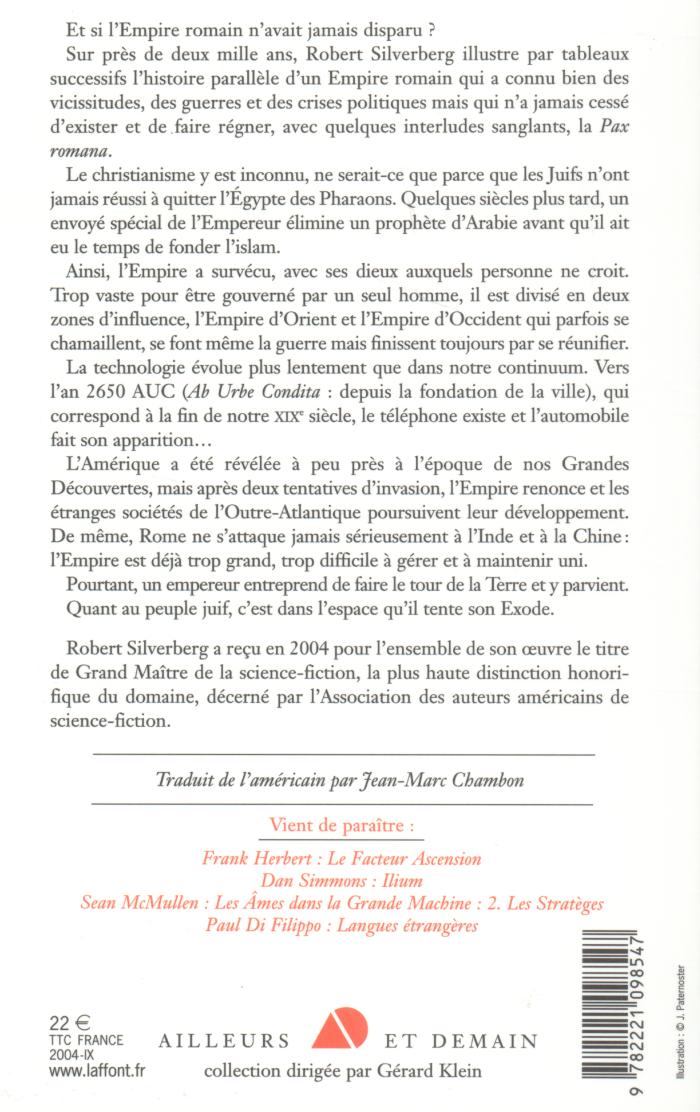 “Et si l’Empire romain n’avait jamais disparu? Sur près de deux mille ans, Silverberg illustre par tableaux successifs une histoire parallèle d’un Empire Romain qui a connu bien des vicissitudes, des guerres et des crises politiques mais qui n’a jamais cessé d’exister et de faire régner, avec quelques interludes sanglants, la Pax Romana.