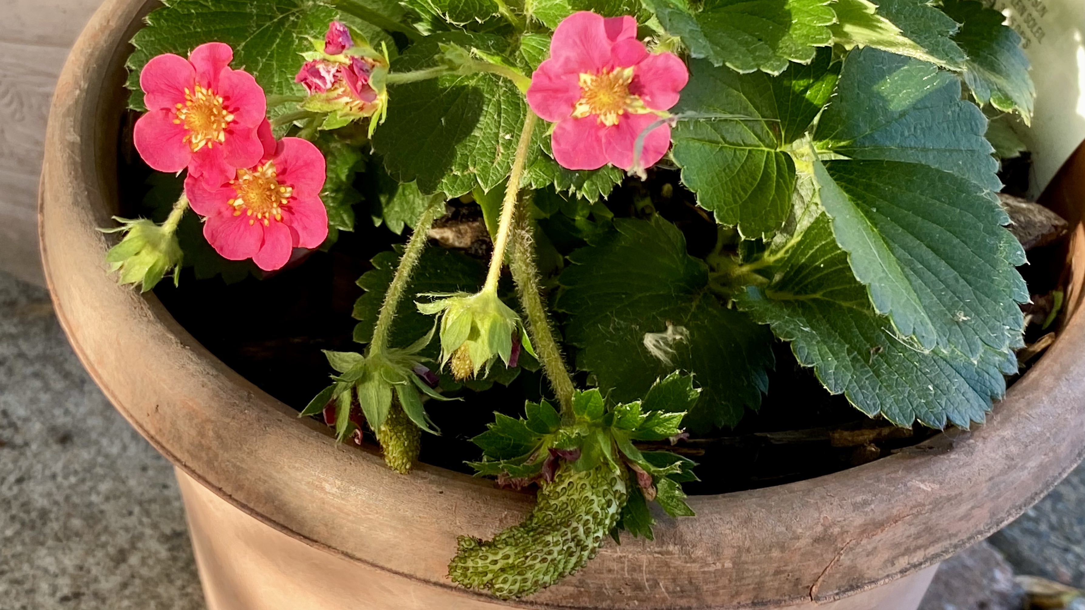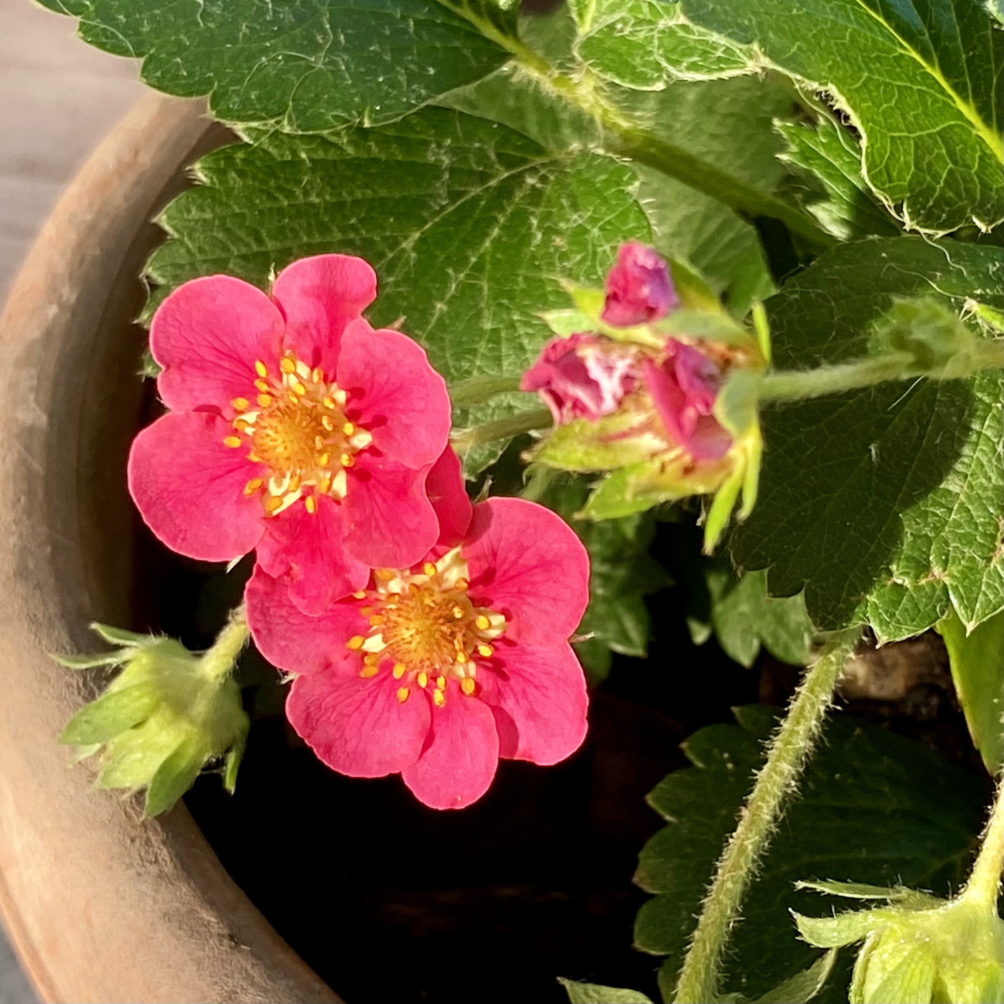 Dans ce cas-ci, il s’agit de fraisiers à fleurs rose qui ont été obtenu par l’hybridation avec un autre genre de Rosaceae, les potentilles, pour obtenir le groupe d’hybrides Fragaria × Potentilla qui aurait l’avantage de produire des fleurs de qualité ornementale mais qui donneraient également de gros fruits rouges facilement commercialisables. Les recherches ont débuté au milieu des années soixante mais n’ont vraiment donné de résultat qu’en 1989 et depuis on retrouve une vingtaine de variétés (comme les ‘AC-Roseberry’, ‘Berries Galore Rose’, ‘Camara’, ‘Fragoo’, ‘Gerald Straley’, ‘Lipstick’, ‘Loran’, ‘Merlan’, ‘Pikan’, ‘Pink panda’, ‘Red ruby’, ‘Roman’, ‘Rosalyne’, ‘Serenata’, ‘Shades of Pink’, ‘Tarpan’, ’Tristan’, ‘Toscana’, et ‘Vivarosa’) mais qui ne donnent pas toutes des fruits volumineux ou abondants. Je ne suis pas sûr quelle est la variété que j’ai dans mon jardin, mais celles qui semblent le plus commercialisées ici sont les “Rose Belle” et les “Toscana”. (Sources: Wikipedia et divers sites horticoles)