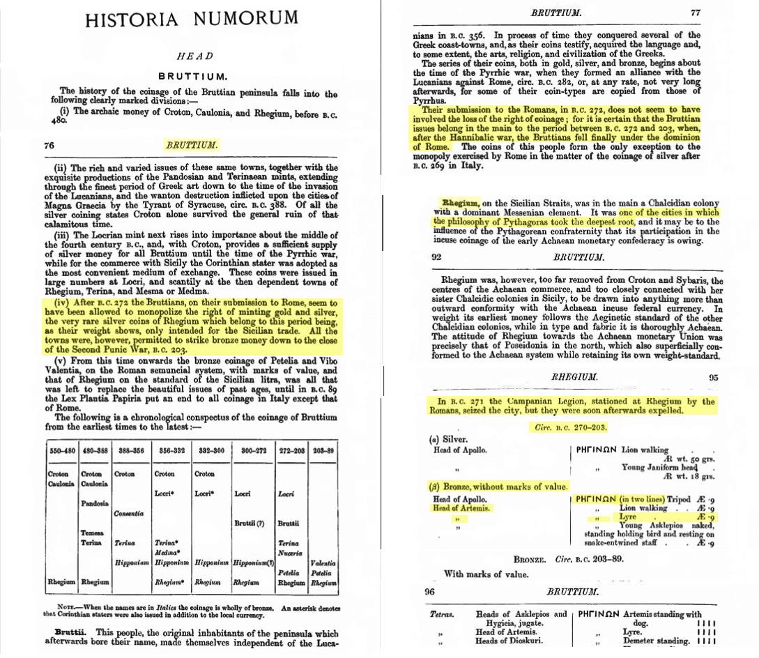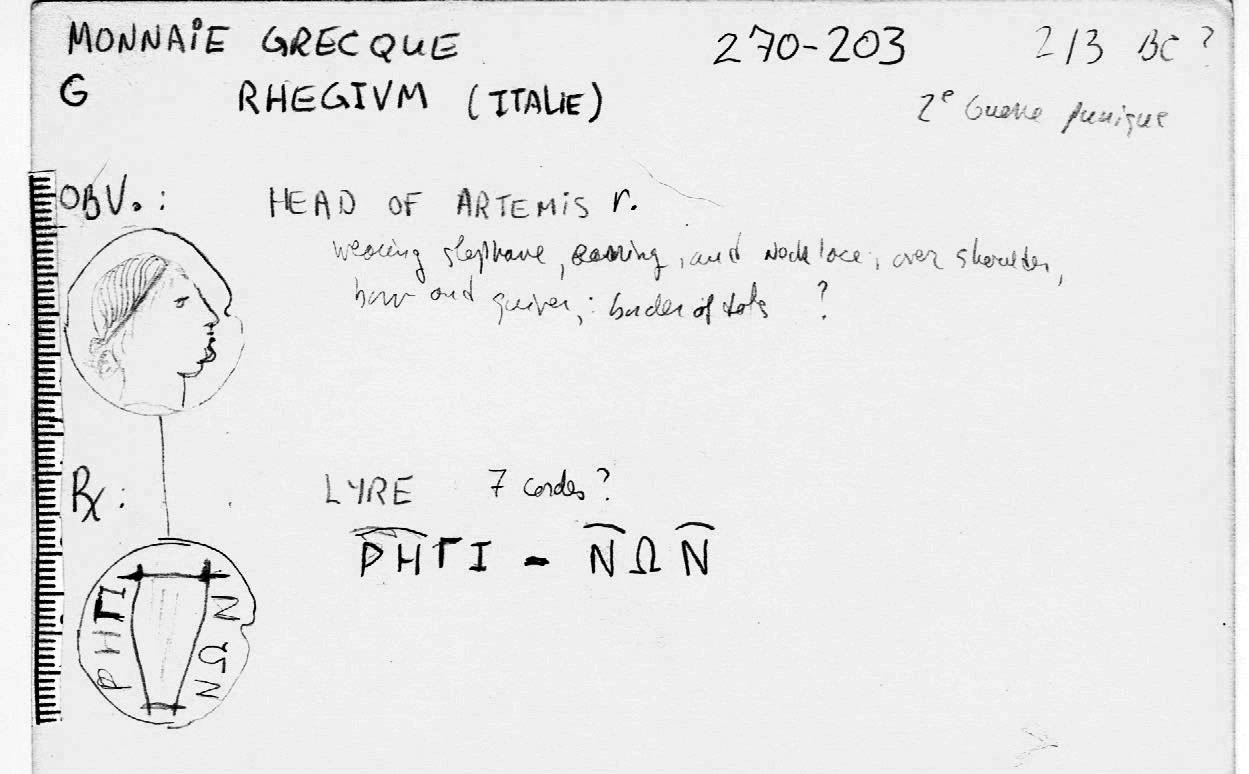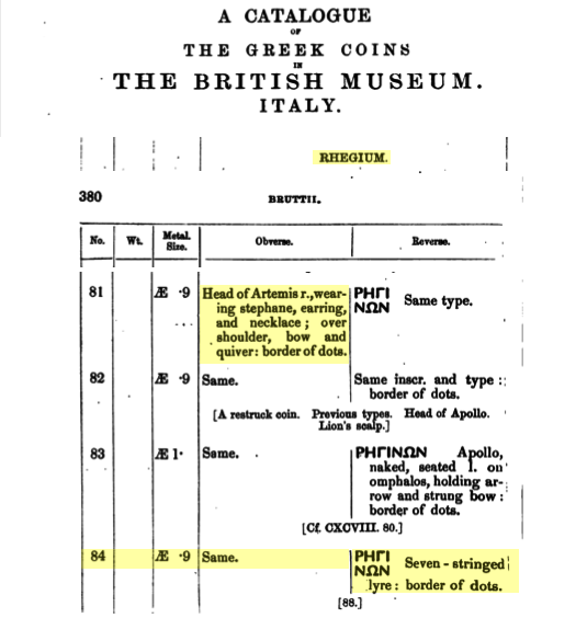 Sources: Wikipedia (Artémis [FR/EN], Lyre [FR/EN], Rhegium [FR/EN]), FAC (Artemis, Bruttium, Lyre); Head B.V., H.N.: pp. 75-77, 91-92, 95; Poole R.S., BMCG v.1: Italy: p. 380. Réf. en ligne: Google, acsearch, eBay, Thirion, WildWinds (SNG ANS 729 (text, image), 729ff (text, image), 731 (text, image)). Voir aussi ma fiche.