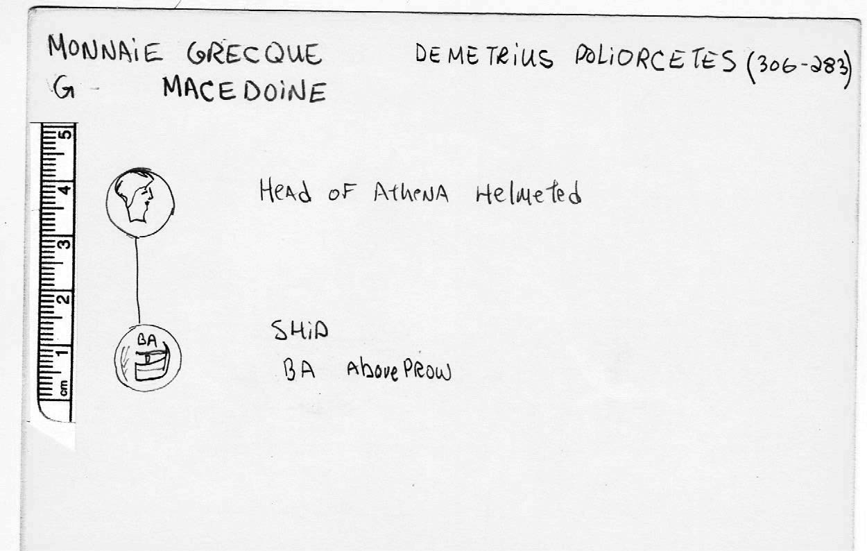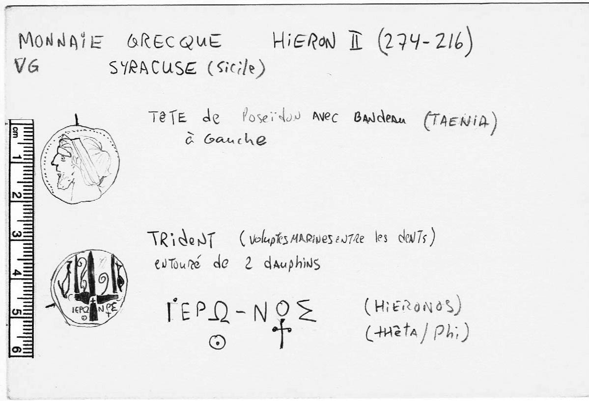 IMG_2075-2088Ma sixième pièce de monnaie grecque est une assez belle obole de bronze (AE23, G [Good], AE [Bronze], 20 x 23 mm [0.9 po], 6.079 g [93.8 grs], payé environ $5 le 1985/01/06, caractérisée par une patine verte avec quelques concrétions rougeâtres; die-axis: ↑↓). L’avers représente une tête d’Artémis, à droite, portant un bandeau (taenia), avec possiblement un arc et un carquois par-dessus l’épaule. Le revers illustre une lyre avec l’inscription grecque verticale PHΓI-NΩN (Ῥήγιον / Rhegion pour la cité grecque de Rhegium) dans le champs de part et d’autre.