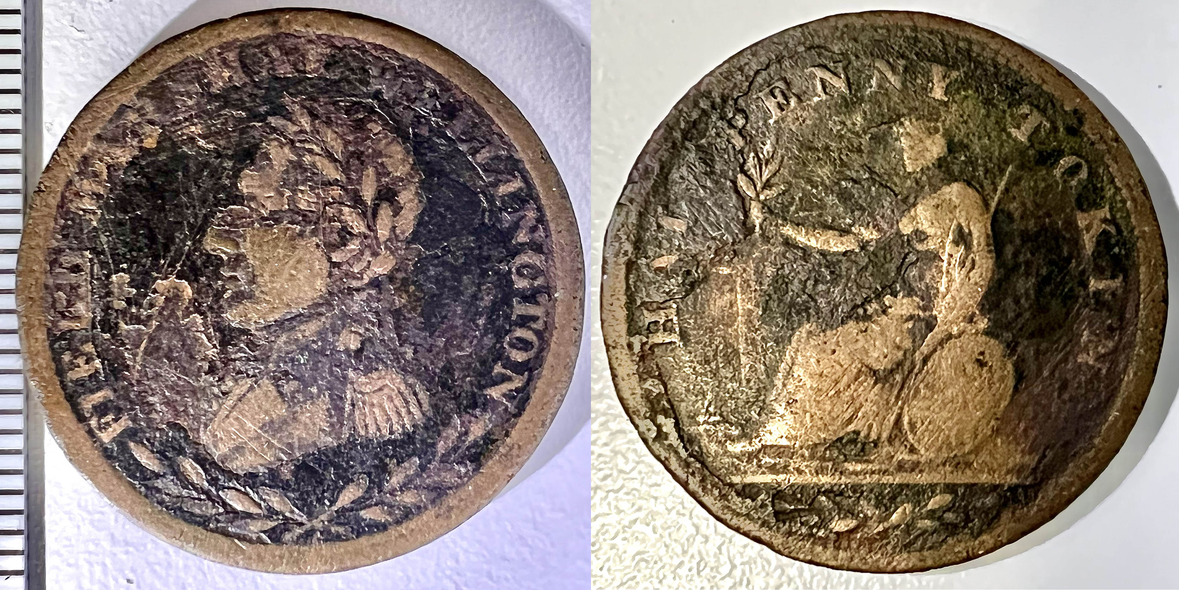 La première pièce est un beau jeton d’un demi-penny (VG [Very Good], Cu [Cuivre], 28 mm (1 mm d’épaisseur), 8 g, axe: ↑↓). L’avers présente un buste de Arthur Wellesley duc de Wellington en habit militaire (j’omet des détails comme le nombre de couette de cheveux qui dépassent de la couronne de laurier [deux?] mais l’épaulette a sept pompons), lauré (onze feuilles) à gauche, avec dessous deux brins de laurier croisés (ayant chacun sept feuilles), une bordure pleine, et l’inscription anglaise FIELD MARSHAL WELLINGTON. Le revers illustre Britannia assise à gauche, un bouclier (possiblement orné d’une croix de saint Georges dont le détail a disparu sur cette pièce) sur le côté gauche, tenant dans la main droite un brin d’olivier (composé de cinq feuilles) et un baton (ou une lance?) dans la gauche (au lieu d’un trident comme sur d’autres pièces), avec en exergue (au lieu d’une date) deux petits brins de laurier croisés (composé de cinq feuilles chacun), une bordure de pointillés, et l’inscription anglaise HALF PENNY TOKEN.