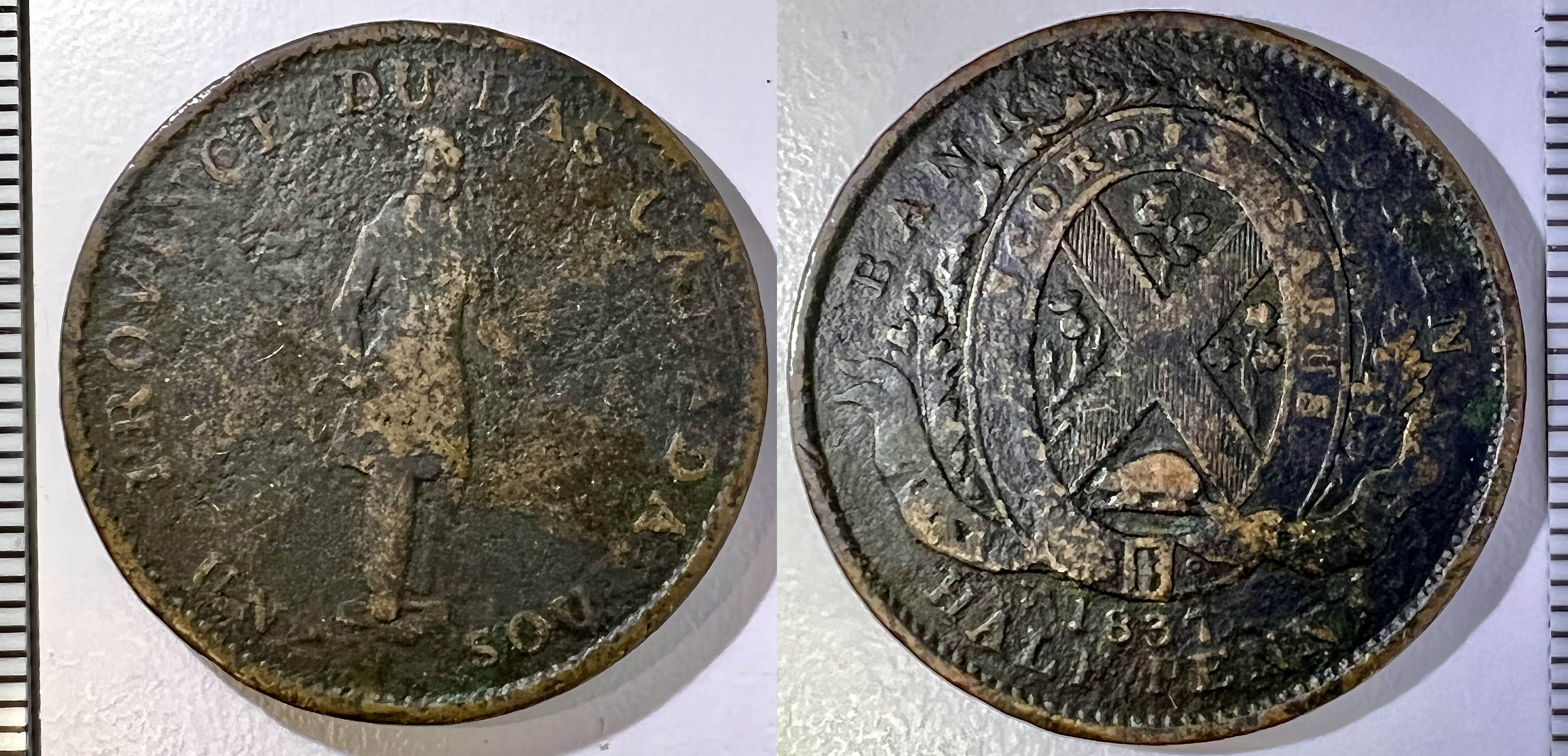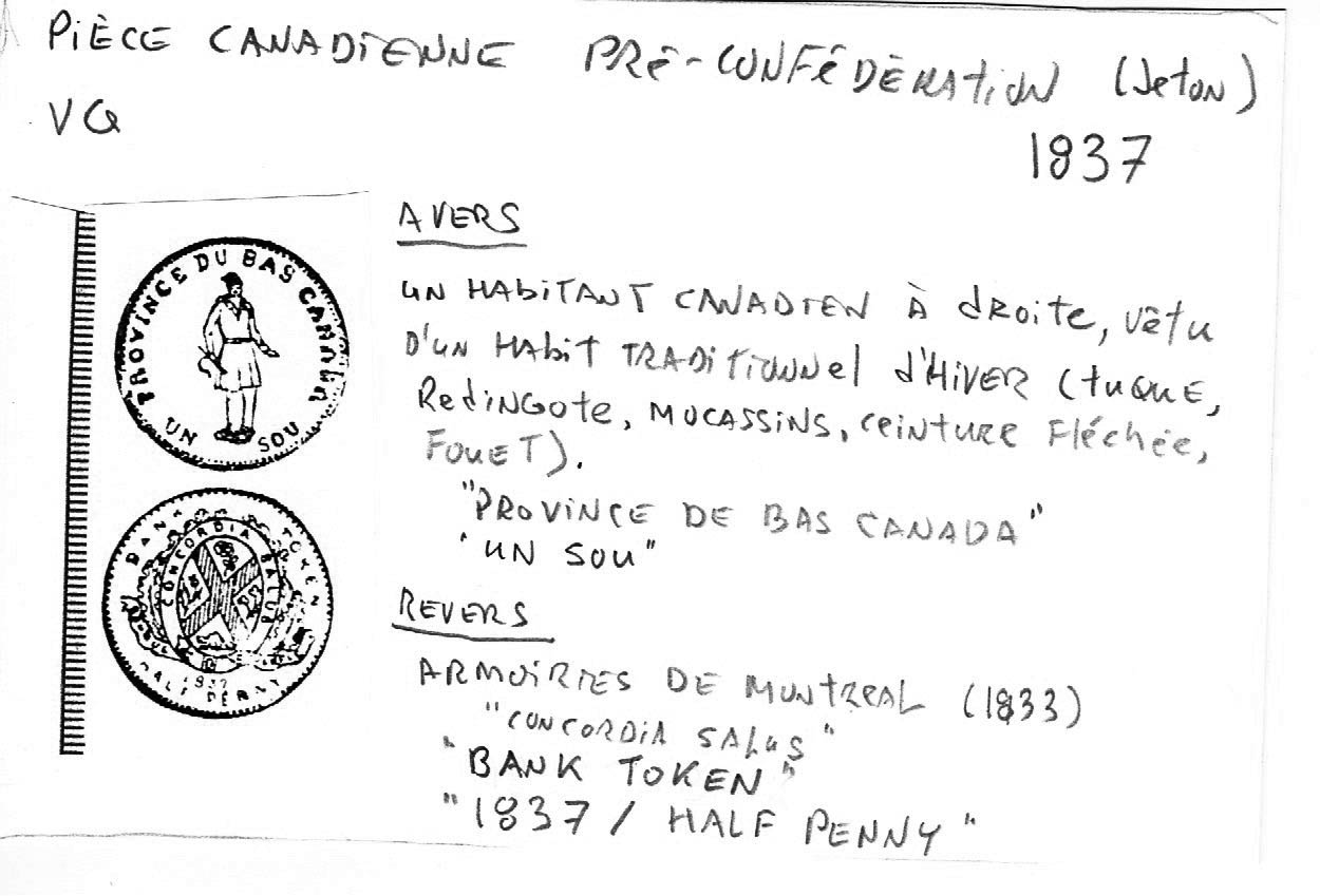 La seconde pièce est aussi un beau jeton d’un demi-penny ou d’un sou (VG [Very Good], Cu [Cuivre], 28 mm (1 mm d’épaisseur), 8 g, axe: ↑↑). L’avers nous montre un habitant debout à droite, vêtu d’un habit traditionnel d’hiver (une tuque bleue, une redingote à capuchon, des mocassins de boeuf, une ceinture [fléchée ?] et un fouet), avec l’inscription française PROVINCE DU BAS CANADA (en haut; le sérif droit du “V” de “Province” semble aligné sur le dessus du “I”) et UN SOU (en bas). Le revers illustre les armoiries de la ville de Montréal inscrites sur le pourtour avec la devise CONCORDIA SALUS (“le salut par la concorde”), dessous, la banderole qui normalement contient la devise, présente plutôt le nom d’une des quatre banques émettrices (que l’usure rend malheureusement illisible dans ce cas-ci), avec les inscriptions anglaises BANK TOKEN (en haut) et 1837 / HALF PENNY. (en bas; une variante de ce type ne comporte pas le point après “PENNY”).