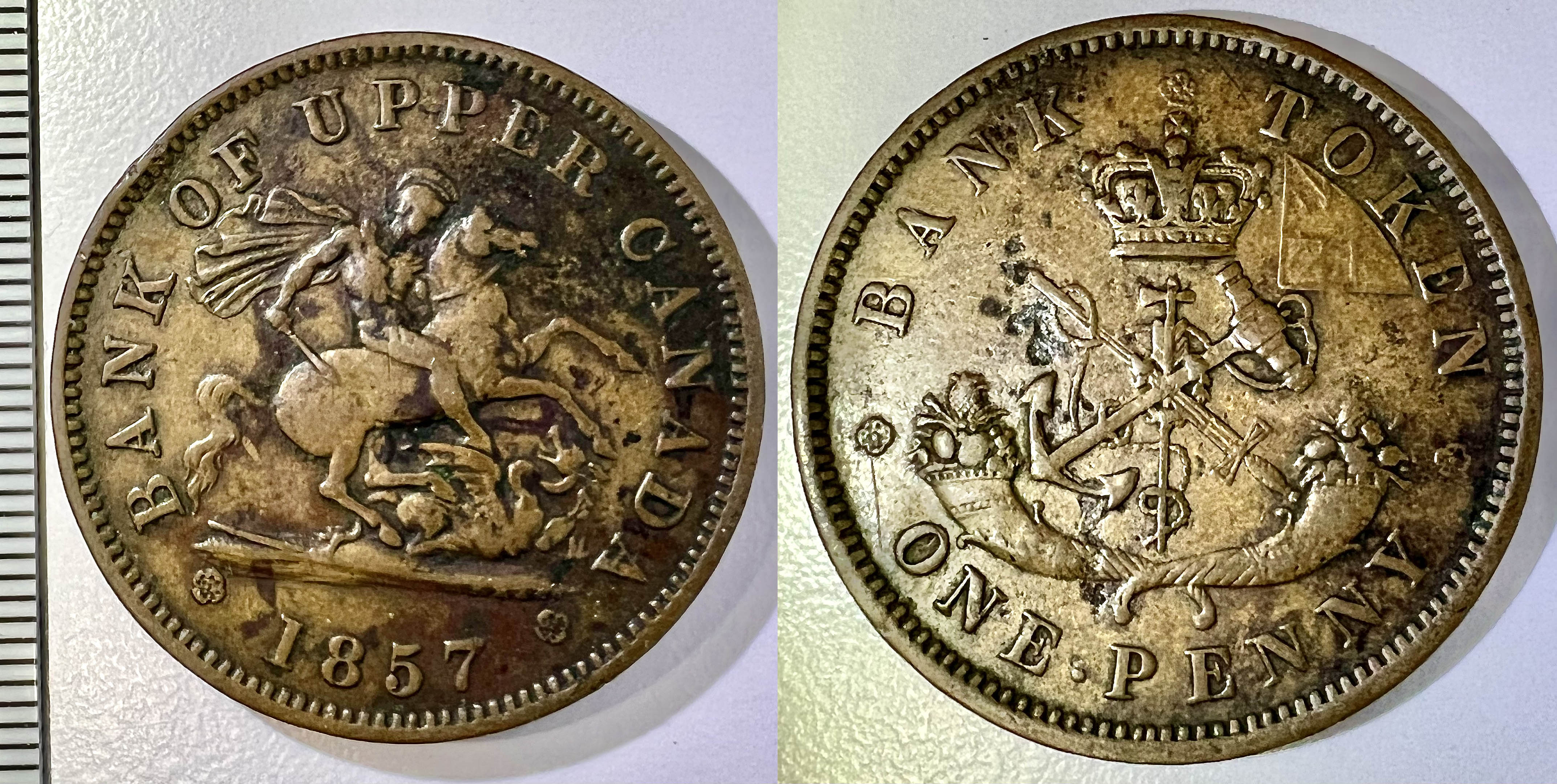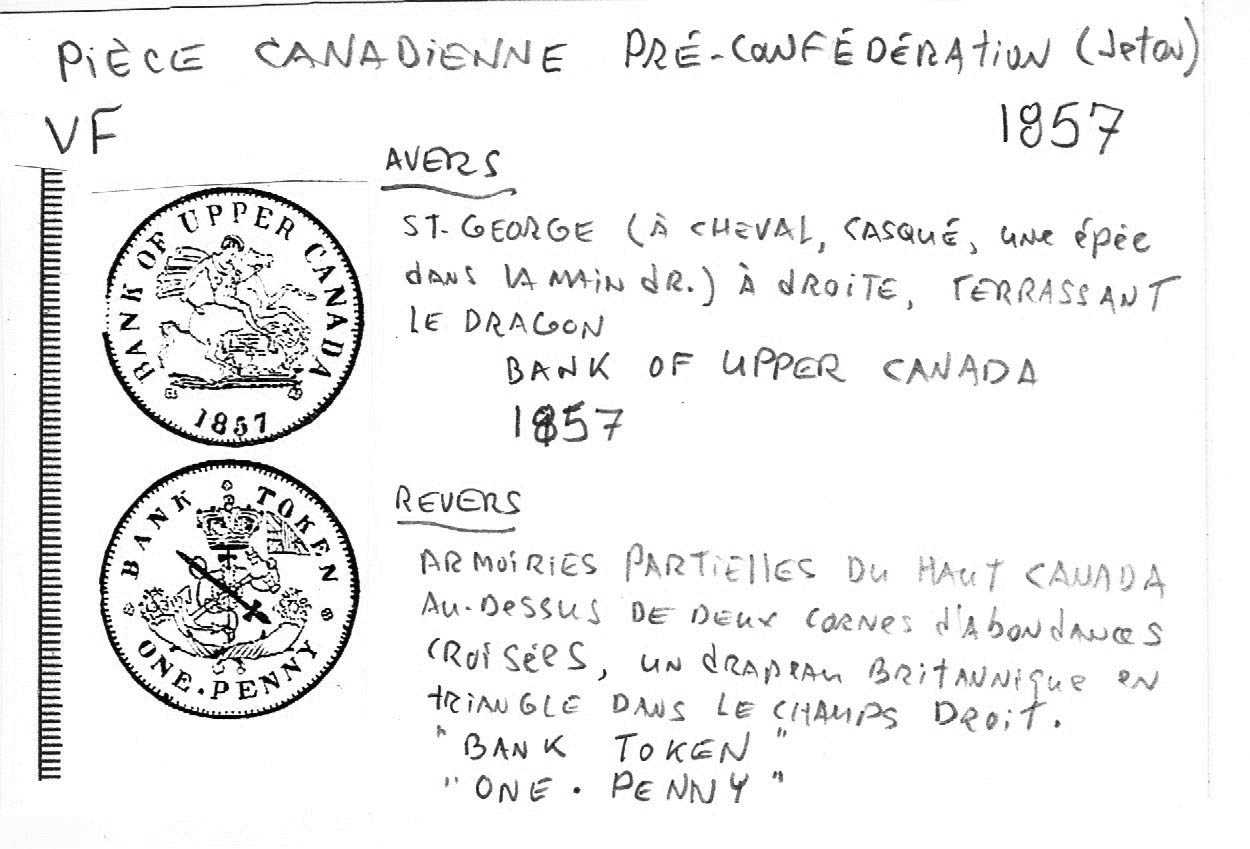 La troisième, et dernière, pièce est un très très beau penny (VF [Very Fine], Cu [Cuivre], 33 mm (2 mm d’épaisseur), 15 g, axe: ↑↓). L’avers représente saint George (à cheval, vêtu d’un casque à cimier, une épée dans la main droite), à droite, terrassant le dragon (piétiné par son cheval), entouré de l’inscription anglaise (encadré par deux fleurons) ❀ BANK OF UPPER CANADA ❀ (en haut) et 1857 (en bas). Le revers illustre une partie des armoiries du Haut Canada (une épée croisée avec une ancre emmêler de cordage et un calumet de paix debout, le tout enfilant une couronne d’olivier et étant surmonté de la couronne royale) au dessus de deux cornes d’abondances croisées, et un drapeau Britannique plié en triangle dans le haut du champs droit, avec l’inscription anglaise (en haut, entouré de trois fleurons) ❀ BANK ❀ TOKEN ❀ et ONE • PENNY (en bas; il existe une variante sans le point).