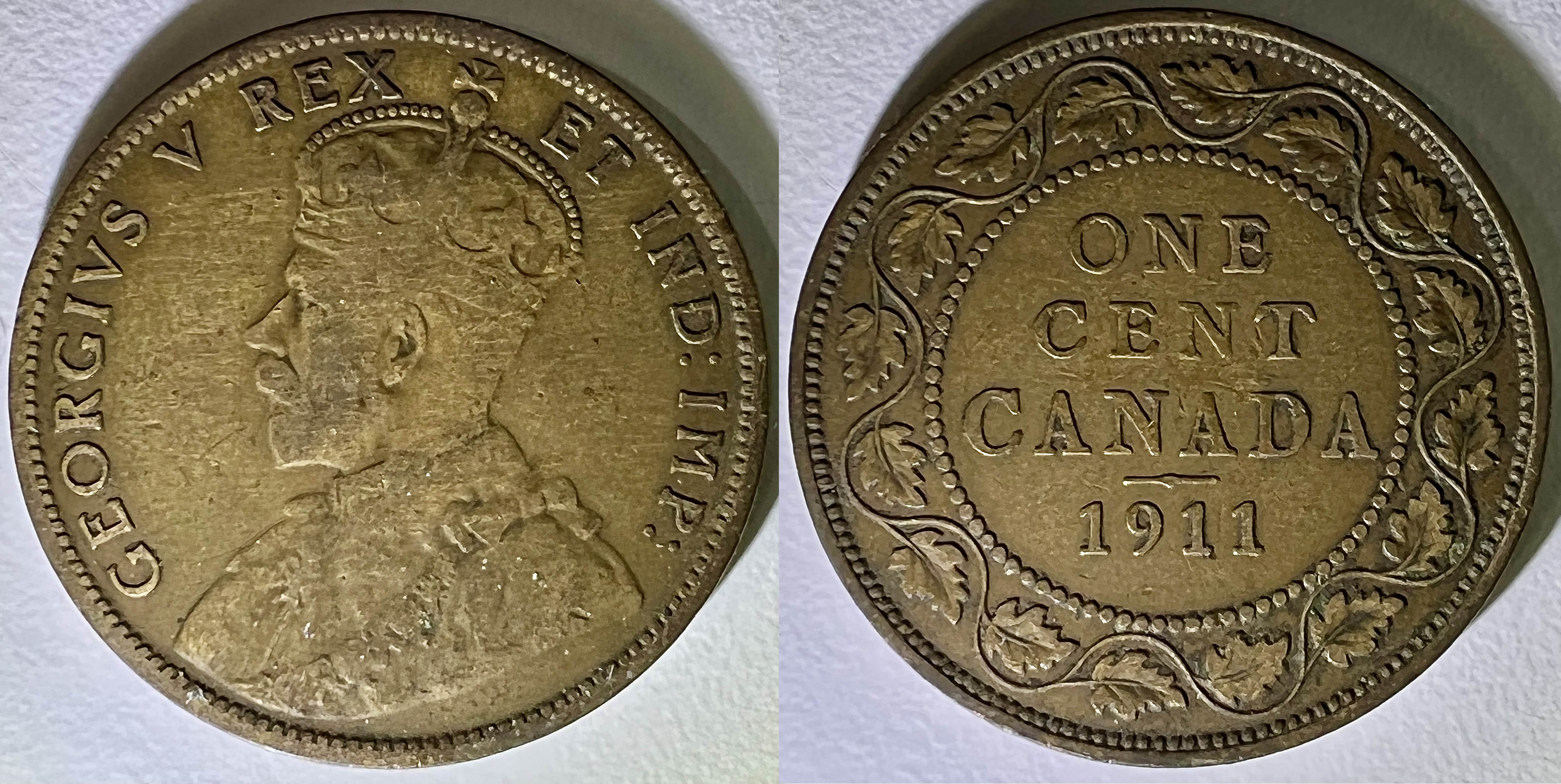 En mai 1910, Edouard VII décède à son tour et est succédé par son fils George V. On en profite cette fois pour mettre à jour l’avers avec le portrait et la titulature du nouveau monarque mais on modifie également le revers. L’avers présente un buste de George V, à gauche, vêtu d’un manteau d’apparat et d’une couronne impériale, avec l’inscription latine GEORGIVS V REX ET IND: IMP: (“George V, roi et empereur des Indes”) — sans doute pour faire place à un titulature plus longue qui souligne que l’Empire Britannique inclus maintenant les Indes on a omis le “Dei Gracia” (“Par la grâce de dieu”). L’illustration du revers reste la même mais l’inscription est changée pour ONE CENT CANADA — 1911 (le “Canada” est déplacé de l’avers au revers et un trait séparateur est ajouté dessous).