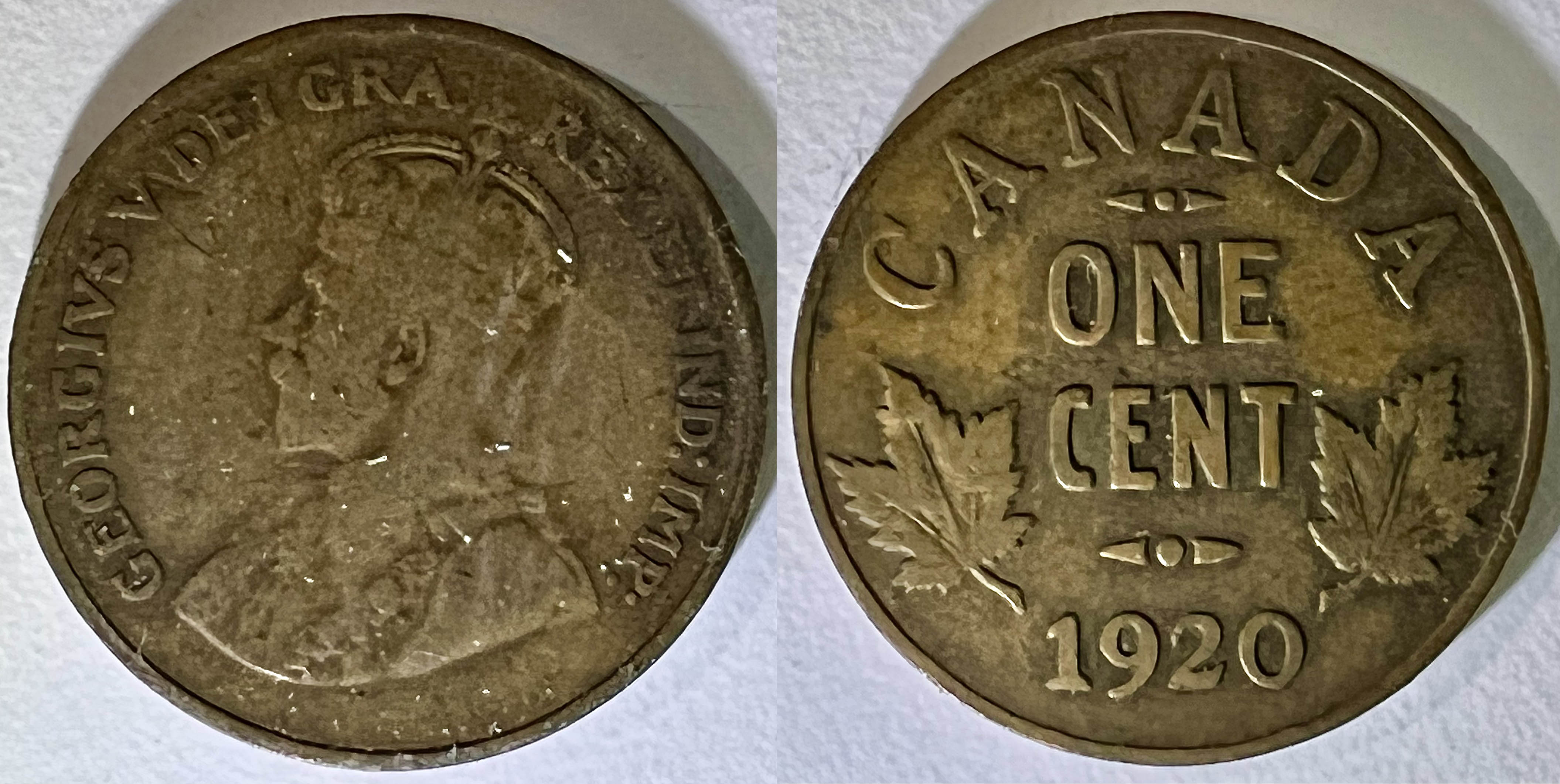 Étrangement, l’absence du “Dei Gracia” souleva un tollé de protestations (on criait à la monnaie “sans dieu”). Ainsi, dès l’année suivante on corrigea la titulature qui devint GEORGIVS V DEI GRA: REX ET IND: IMP: (“George V, par la grâce de dieu, roi et empereur des Indes”). Encore plus mystérieux, j’ai trouvé dans ma collection un cent de 1917 d’une couleur argenté matte (similaire au nickel). Je n’ai toutefois trouvé aucune mention d’une telle production dans les sources numismatiques. Un petit rigolo se sera sans doute amusé en faisant des tests de placage au nickel sur un pièce… En 1920, on change également très légèrement le titrage métallique de la pièce d’un cent: la proportion de cuivre est augmenté à 95.5%, celle de l’étain diminuée à 3% et celle du zinc augmenté à 1.5%. Cela est sans doute motivé par un accroissement du coût de certains métaux et annonce la réduction imminente de la taille de la pièce d’un cent.