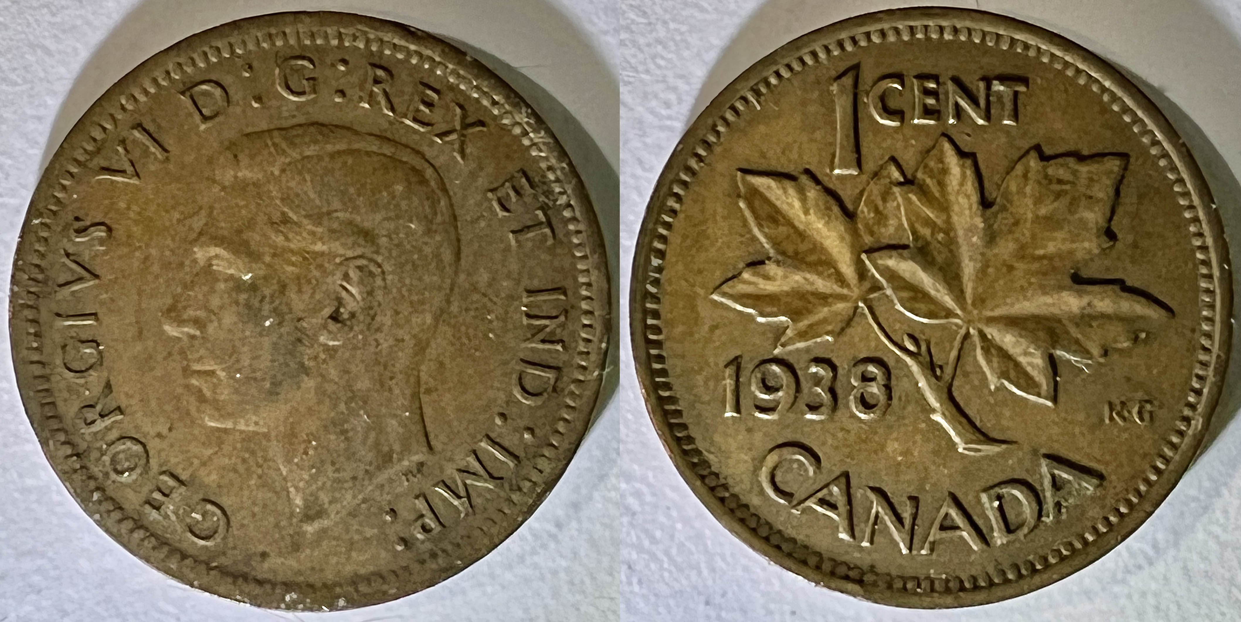 Après l’accession de George VI, pour accélérer la production des nouveaux coins de frappe, l’atelier monétaire de Paris est mis à contribution (Ae [Bronze composé de 95.5% de Cu, 3% Sn et 1.5% Zn], 19 mm, 3 g, axe: ↑↑). L’avers du cent est modifié (portrait et titulature, sur un dessin de T.H. Paget — qui signe d’un petit “HP” dessous la tête) pour refléter le nouveau monarque et on en profite pour finir de moderniser le revers en lui donnant ce qui sera son apparence définitive (dessin et gravure de G.E. Kruger-Gray — signature d’un petit “K•G” dans le champs droit). Et la bordure en pointillé est de retour! L’avers présente une tête nue (sans couronne) de George VI, à gauche, avec l’inscription latine GEORGIVS VI D:G:REX ET IND:IMP: (“George VI, par la grâce de dieu, roi et empereur des Indes”). Le revers illustre maintenant une brindille de deux grandes feuilles d’érable (représentant sans doute les deux peuples fondateurs du pays: les français et les anglais — à cette époque on négligeait encore les autochtones), avec l’inscription en haut 1 CENT (le fait de mettre la valeur en chiffre règle la question du bilinguisme), la date d’émission (ici: 1939) dans le champs gauche et Canada dans le bas. En 1942, on change encore le titrage métallique en diminuant la proportion d’étain à 0.5% et augmentant celle du cuivre à 98%.