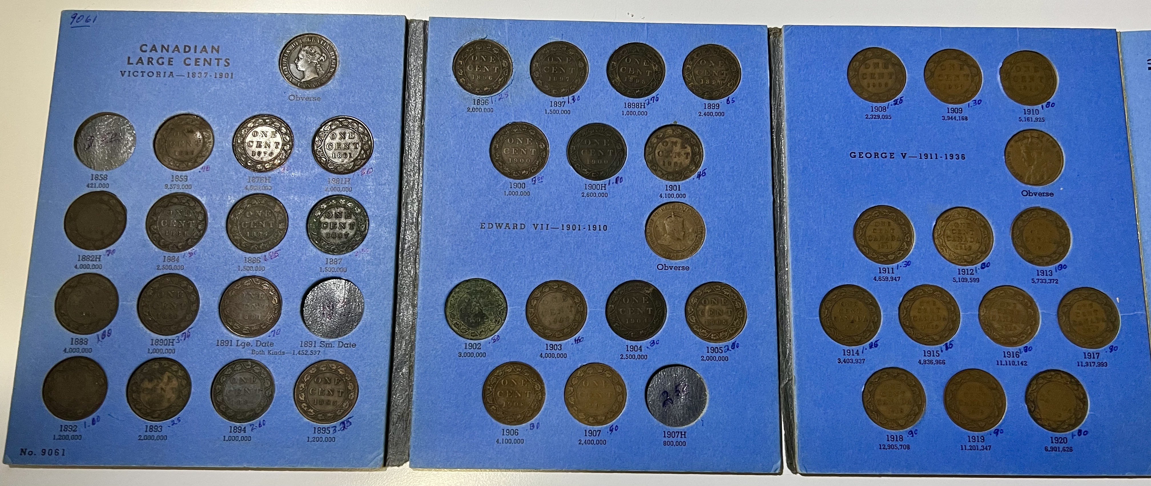 La Province du Canada n’est toutefois toujours pas en mesure de produire sa monnaie localement. La frappe est donc encore effectuée par la Royal Mint de Londres (sans marque de frappe) et l’atelier de la Heaton Mint à Birmingham (indiqué par un petit “H” sur le revers, sous la date). Comme la production est maintenant mécanisée on retrouve, contrairement aux pièces plus anciennes, une très grande uniformité dans la taille et le poids des pièces. Les seules éléments qui changent sont les portraits des monarques et leur titulatures, ainsi que de menu détails dans le dessin (la grosseur du feuillage, la forme de tel chiffre ou telle lettre, etc. — je ne m’attarderais pas sur ces derniers, sauf les plus significatifs, car ils sont trop nombreux. Ainsi le gros sou a connu au fil des ans cinq variations importantes dans son type.