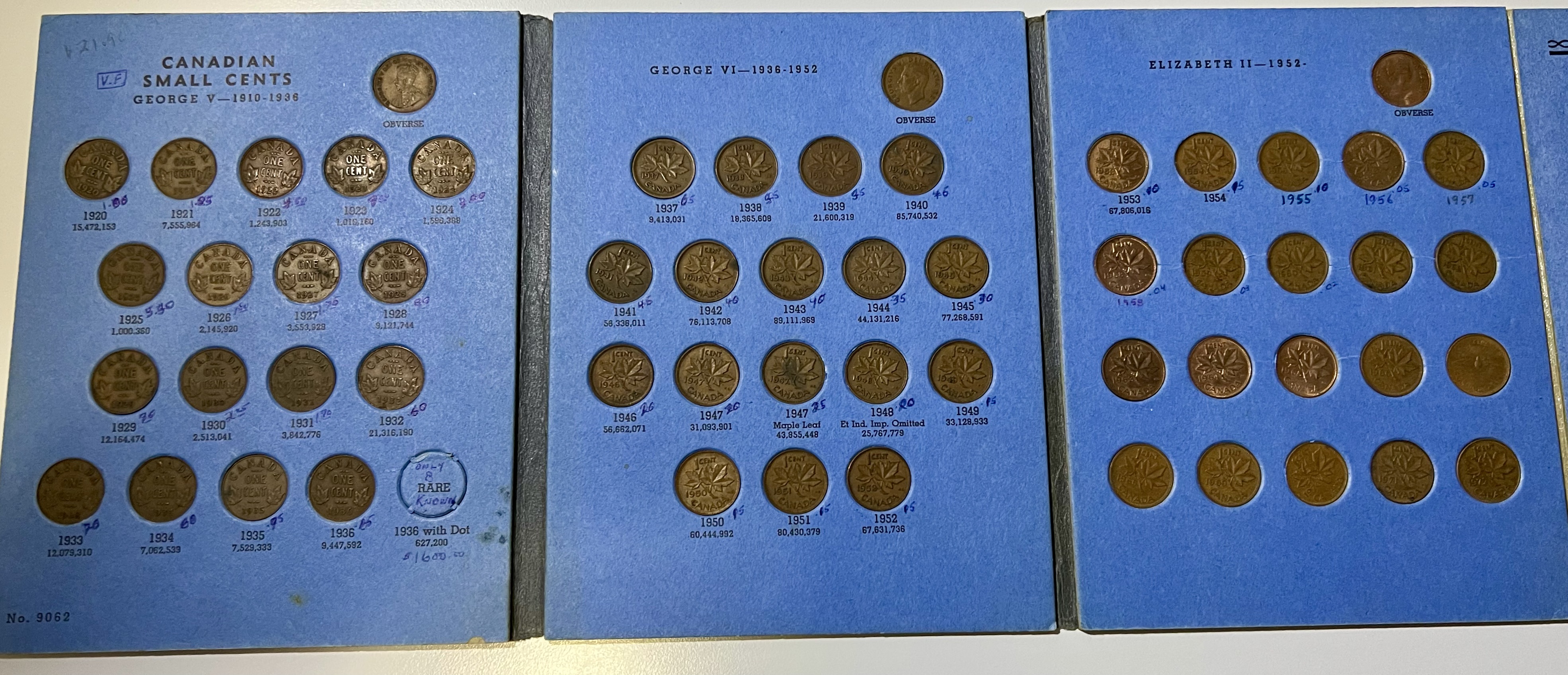 En janvier 1936, George V décède et est succédé par son fils Édouard VIII. Toutefois, en décembre de la même année, avant même qu’on frappe la monnaie canadienne à son effigie, celui-ci abdique (suite à un scandal) en faveur de son frère George VI. En 1937, en attendant que les coins de frappe soit prêt avec l’effigie du nouveau monarque, on frappa une petite quantité de pièces de 1936 mais en ajoutant un petit point sous la date pour distinguer cette émission exceptionnelle. C’est la seule petite pièce de un cent que je n’ai pas car elle extrêmement rare.