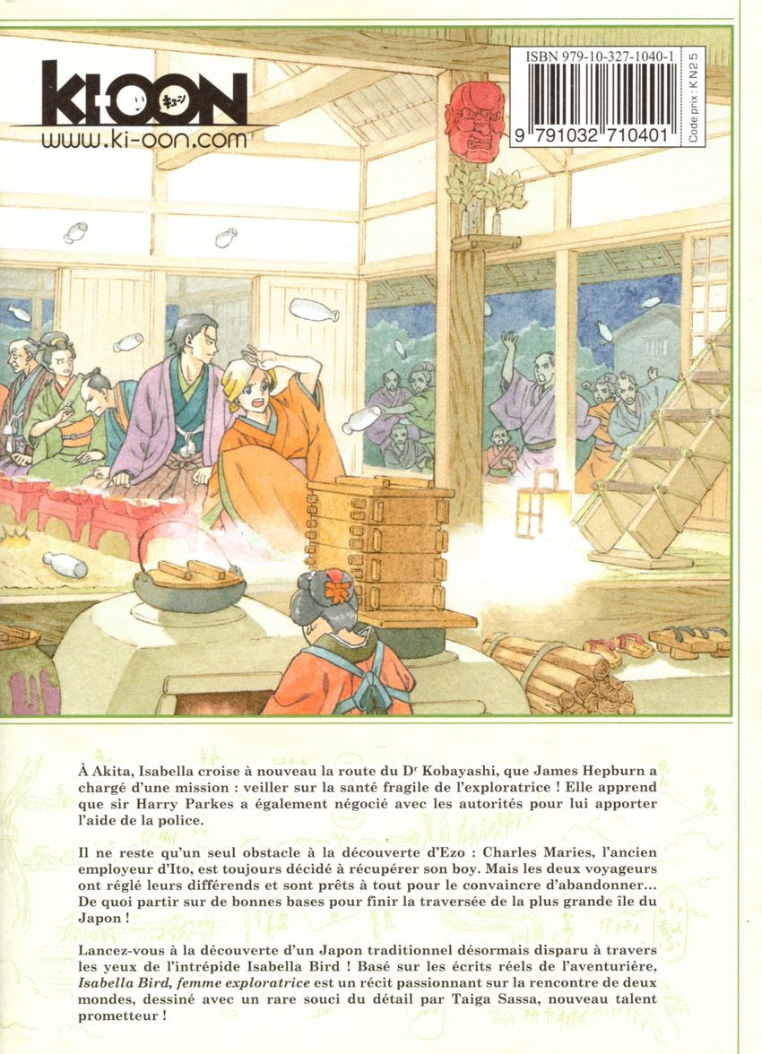Isabella Bird, femme exploratrice T.8 par Taiga SASSA. Paris: Ki-oon (Coll. Kizuna), décembre 2021. 208 pg, , 13 x 18 cm, 7,90 € / $14.95 Can., ISBN 979-10-327-1040-1. Pour lectorat adolescent (12+).
