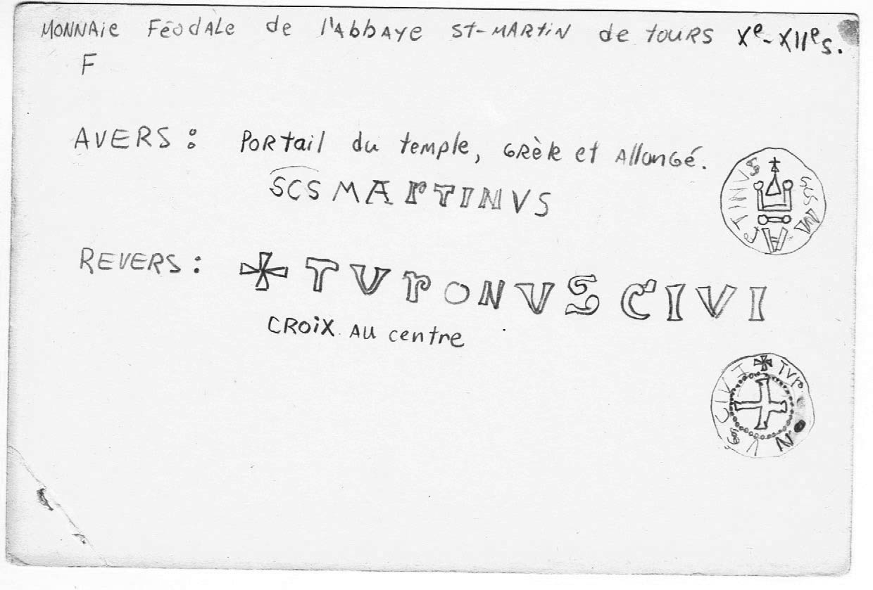 Martinus Turonensis meurt à Candes le 11 novembre 397 et est enterré à Tours où il sera adoré comme Saint. En 470, l’évêque Perpétuus fait construire une grande basilique sur l’emplacement du tombeau. C’est là que, en 508, Clovis reçoit les pouvoirs consulaire de l’empereur d’Orient Anastase Ier et qu’il célèbre son triomphe sur les Wisigoths. Une abbaye y est établie vers le milieu du VIe siècle mais, suite aux réformes de Pépin le Bref qui imposaient la règle de saint Benoît à tous les monastères, la communauté des clercs devient une “collégiale” de chanoines en 817. A cette époque le pouvoir est divisé en petites comtés. Dès le Xe siècle, Tours est l’une des première cité à frapper monnaie mais le denier tournois sera rapidement imité (on retrouve donc le denier provinois en Champagne, le denier angevin en Anjou, le denier tolosain à Toulouse, etc.). Toutefois, au début du XIIIe siècle (1204), Philippe Auguste se saisit de la région et dès lors la monnaie portera sur l’avers sa titulature: PHILLIPVS REX.