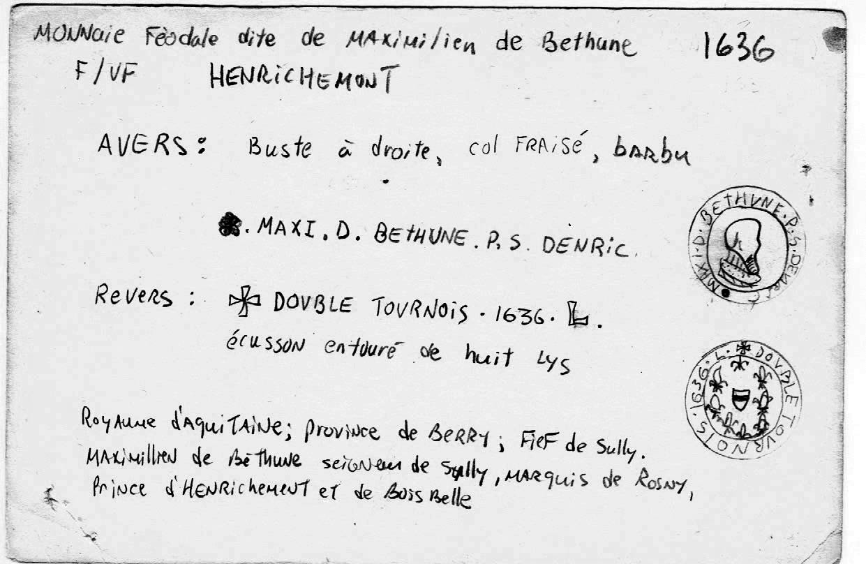 Cette pièce de monnaie de la Renaissance est un très beau double tournois (F [Fine], Cu [Cuivre], 20 mm [0.79 po], 3.0873 g, payé environ $6 [30 FF], caractérisé par une patine brune tâchée de vert-de-gris; die-axis: ↑↓). L’avers présente, dans un cercle, un buste barbu à droite de Maximilien de Béthune, portant une large fraise et un manteau recouvert de mouchetures d’hermine, avec l’inscription française (débutant à 6h avec un fleuron) ❀ • MAXI • D • BETHVNE • P • S • DENRIC • (pour “MAXImilien De BETHUNE Prince Souverain D’hENRIChemont”). Le revers illustre un petit écu d’Henrichemont au centre, entouré dans le champ par huit lys (⚜︎), avec l’inscription française (débutant à 12h par une croix pattée) ✠ • DOVBLE • TOVRNOIS • 1636 • L •.