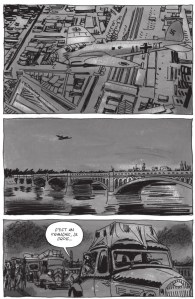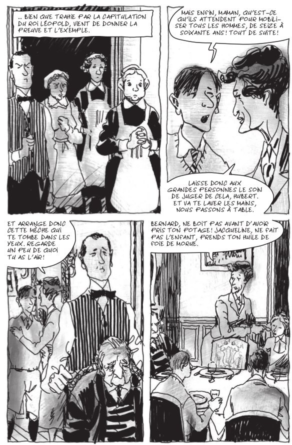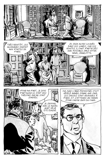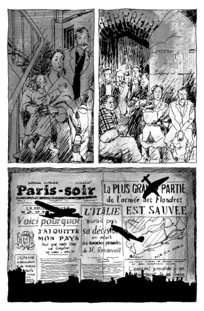 La nouvelle de la débâcle de Dunkerque et de l’approche allemande pousse de nombreux Parisiens à l’exode vers le sud afin de fuir les combats et l’inévitable occupation. Nous suivons ainsi une vingtaine de personages qui tentent de fuir Paris puis, pour la plupart, qui y reviennent lorsqu’ils apprennent que la ville a été épargnée de la destruction. Le récit trace un intéressant portrait de la société française de l’époque mais le fait de constamment alterner d’un groupe de personnages à l’autre rend le tout un peu confus. Toutefois, avec son style sombre mais réaliste — un dessin un peu brouillon et en tons de gris, très populaire ces temps-ci mais qui m’agace beaucoup — Moynot (surtout connu pour avoir reprit Nestor Burma après Tardi) fait un excellent travail pour illustrer les petits drames de chacun exacerbés par la guerre. C’est une intéressante bande-dessinée pour l’amateur d’histoire que je suis, avec un bon récit (mais sans plus). Toutefois, ce qui rend ce titre fascinant c’est l’oeuvre dans laquelle il s’inscrit.