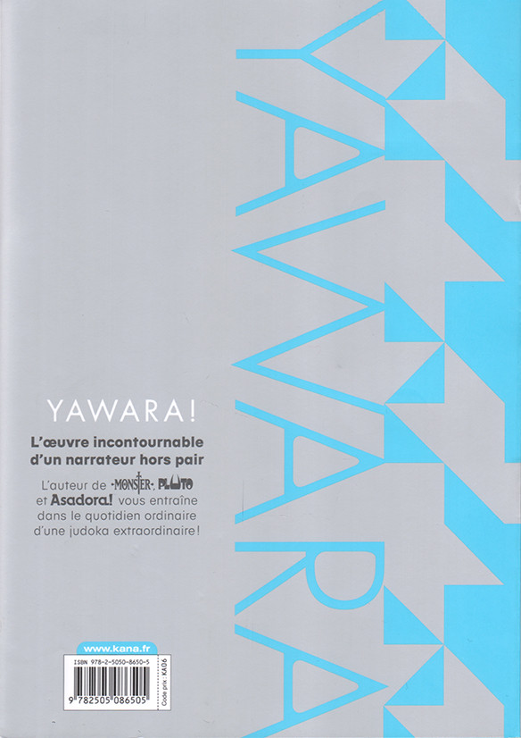 Yawara t. 4, par Naoki Urasawa. Bruxelles: Kana (Coll. Big Kana), avril 2021. 290 pages, B&W (xx pages en “couleurs”), 14.8 x 21 cm, 15.00 € / $C 26.95, ISBN 978-2-5050-8650-5, Pour un lectorat adolescent (12+).