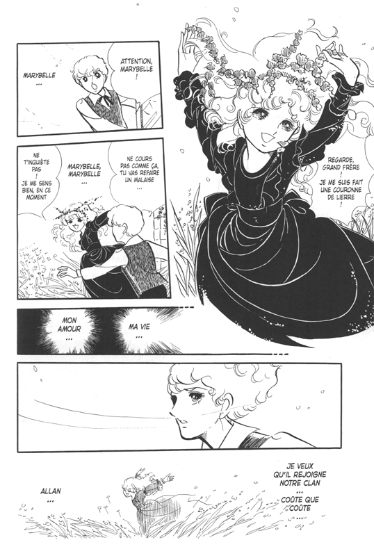 Ce premier volume comprends neuf récits: “Le Clan des Poe” (ポーの一族 / Poe no ichizoku, 127 pages, sérialisé dans les numéro de septembre à décembre 1972 de la revue Bessatsu Shōjo Comic), “La Jeune Fille aux cheveux d’argent” (すきとおった銀の髪 / Sukitōtta gin no kami, 16 pages, mars 1972), “Le Village de Poe” (ポーの村 / Poe no mura, 24 pages, juillet 1972), “Le Journal de Glensmith” (グレンスミスの日記 / Glensmith no nikki, 24 pages, août 1972), “Marybelle et la rose d’argent” (メリーベルと銀のばら / Marybelle to gin no bara, 162 pages, de janvier à mars 1973), “Penny Rain” (ペニー・レイン, 40 pages, mai 1975), “Liddell dans la forêt” (リデル・森の中 / Liddell, mori no naka, 16 pages, juin 1975), “Les Fleurs et les oiseaux du pays lointain” (はるかな国の花や小鳥 / Harukana kuni no hana ya kotori, 33 pages, dans Shūkan Shōjo Comic de septembre 1975), et “Une semaine” (一週間 / Isshūkan, 16 pages, dans Bessatsu Shōjo Comic de décembre 1975). On retrouve également une préface de Fausto Fasulo, une postface de Miyako Slocombe et une galerie d’illustrations. J’ai bien hâte de lire la suite avec le deuxième volume annoncé pour la fin octobre 2023.