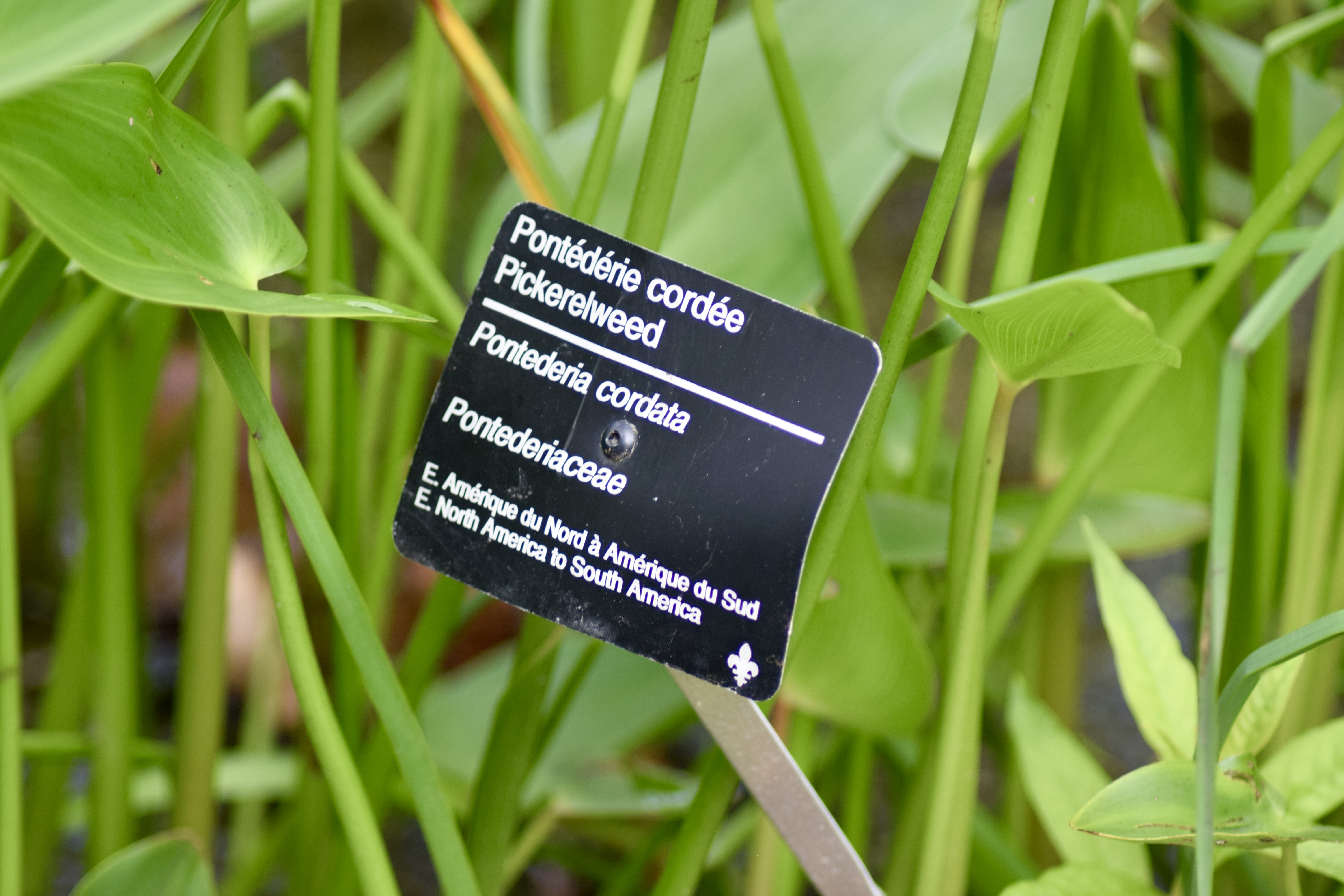 La pontédérie à feuilles en cœur (appelée pickerelweed en anglais) est une espèce de plante appartenant à la division des Magnoliopsida (ou Angiospermae, i.e. les plantes à fleurs), à la classe des Liliopsida (ou Monocotyledonae, i.e. à un seul cotylédon), à l’ordre des Liliales (selon Cronquist ou Commelinales selon APG IV où elle comprend cinq familles regroupant près de neuf cent espèces), à la famille des Pontederiaceae (comprenant environ sept genres regroupant une trentaine d’espèces selon Cronquist ou deux genres comprenant une quarantaine d’espèces selon APG IV) et au genre Pontederia (qui inclut vingt-cinq espèces). Le nom scientifique rend hommage au botaniste italien Giulio Pontedera alors que l’épithète spécifique signifie simplement “coeur” en latin.