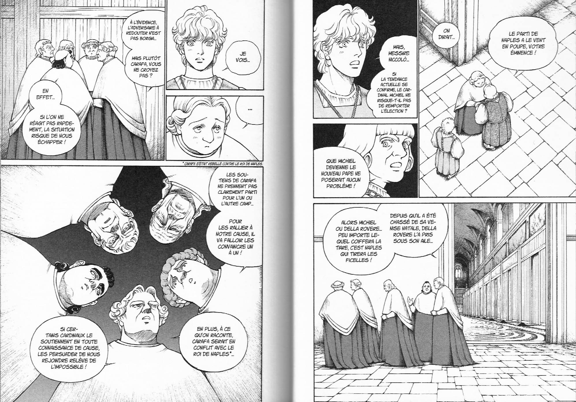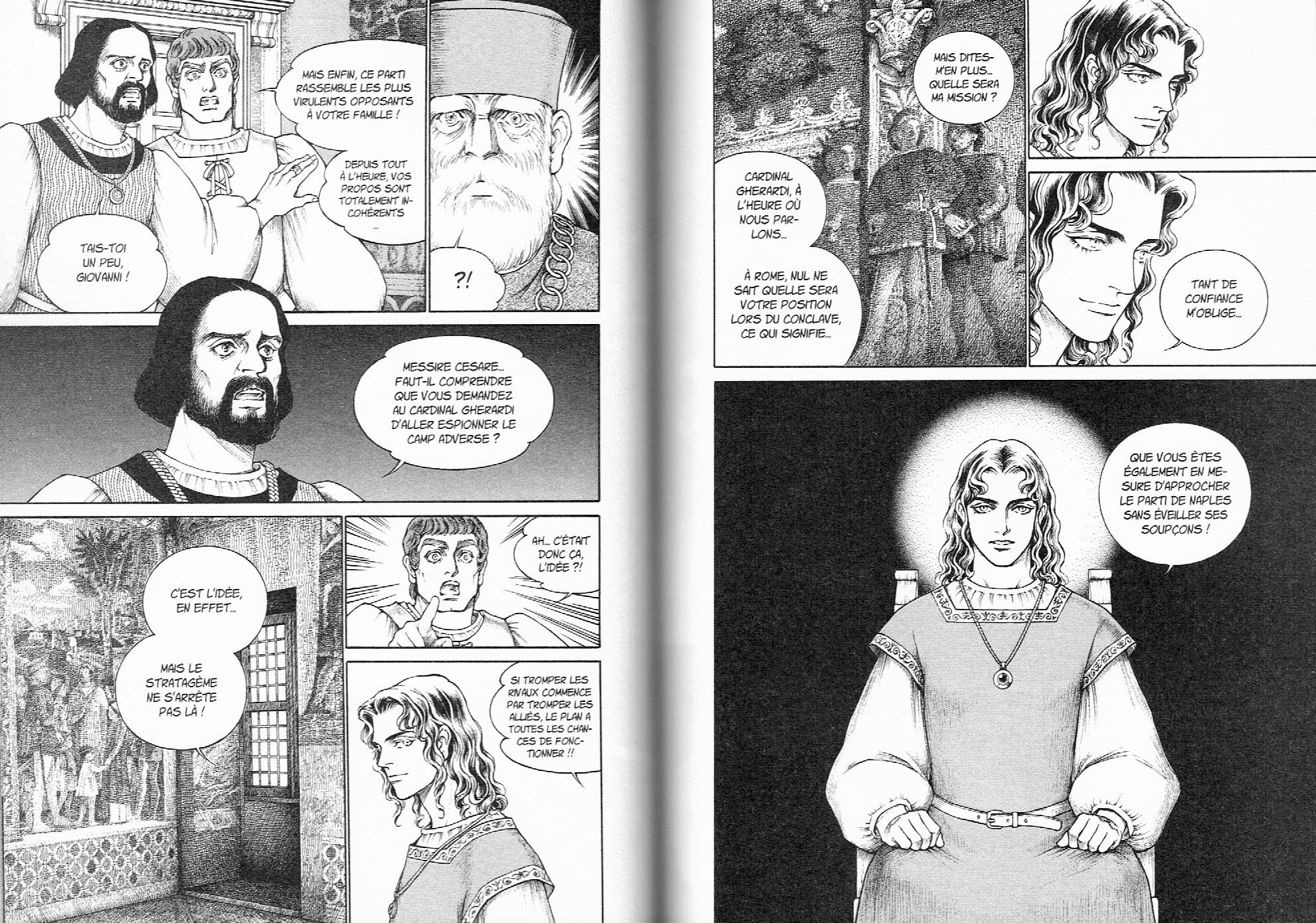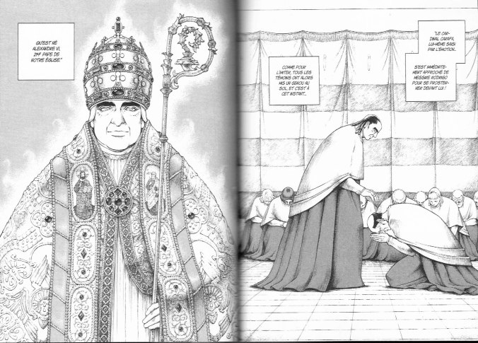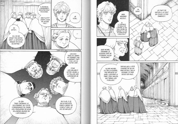 Près de quatre ans après la parution du tome précédent, Fuyumi Soryo nous offre finalement la conclusion de ce manga biographique consacré à la jeunesse de Cesare Borgia. Même si le récit est sans aucun doute fortement romancé, l’histoire est très bien documentée. Elle nous fait découvrir non seulement les personnages et les évènements qui ont marqués les débuts de la Renaissance Italienne mais aussi illustre de nombreux éléments de la culture de l’époque, comme les costumes et l’architecture. Tout au long du récit, l’ouvrage a su conserver une qualité graphique qui étonne de par son dessin clair, précis et très détaillé. C’est donc un excellent manga qui est non seulement divertissant et très agréable lire de par ses intrigues politiques captivantes mais aussi très stimulant de par la richesse de l’information historique qu’il nous offre. C’est un manga incontournable que je recommande fortement, surtout aux amateurs de manga historiques et particulièrement si l’histoire ecclésiastique et italienne vous intéresse.