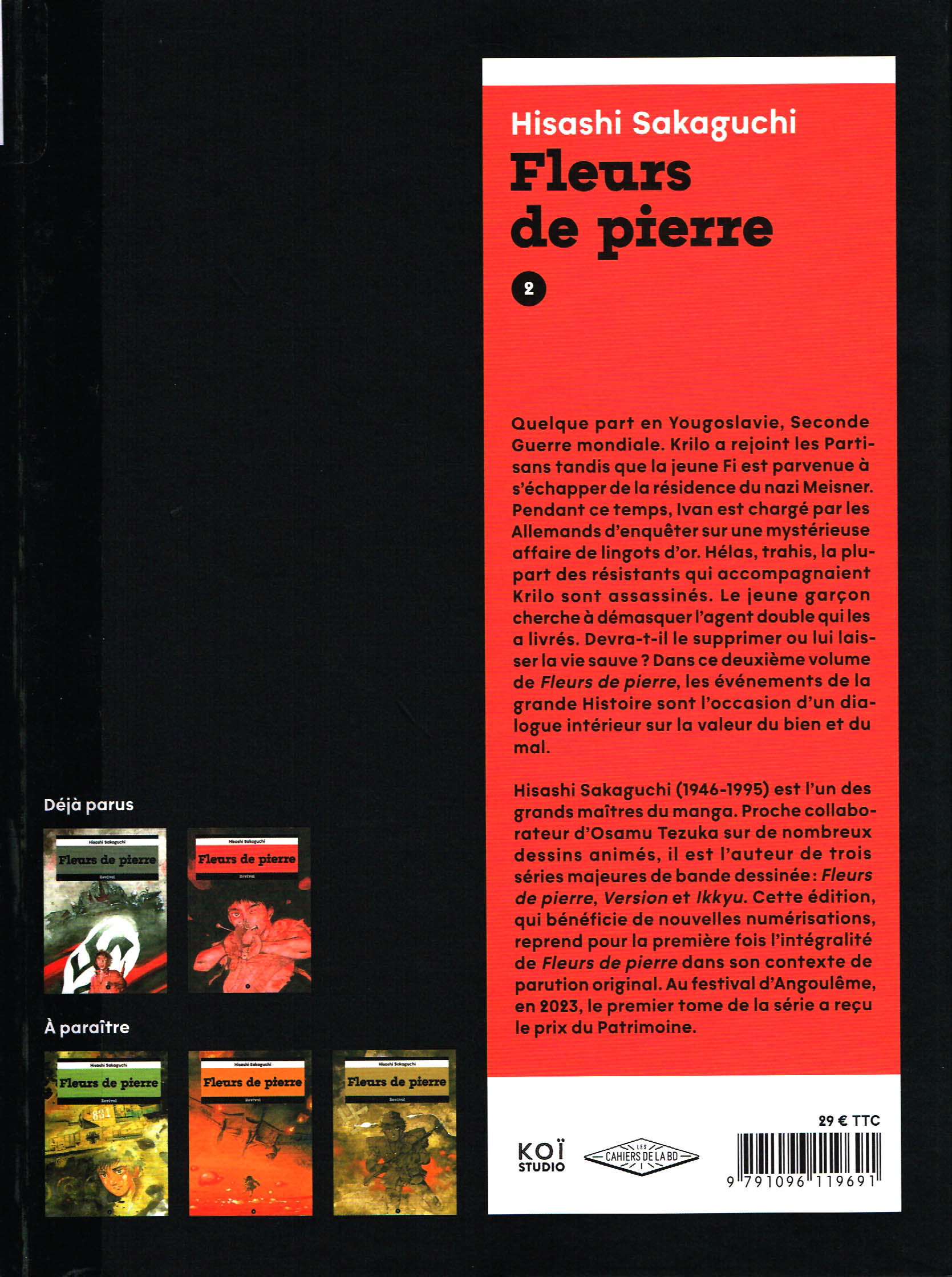 Fleurs de pierre (石の花 / Ishi no Hana) est un manga seinen par Hisashi Sakaguchi qui nous offre, chose rare, un drame historique prenant place en Yougoslavie durant la deuxième guerre mondiale. Il a été d’abord publié en feuilletons dans Comic Tom entre mars 1983 et août 1986 avant d’être compilé en six volumes chez Ushio Shuppansha (1984-1986). Une édition française complète, avec une nouvelle traduction par Ilan Nguyen et présentant des planches renumérisées, est publiée aux Éditions Revival depuis octobre 2022 dans un grand format qui offre le sens de lecture original. J’ai déjà commenté le premie volume.